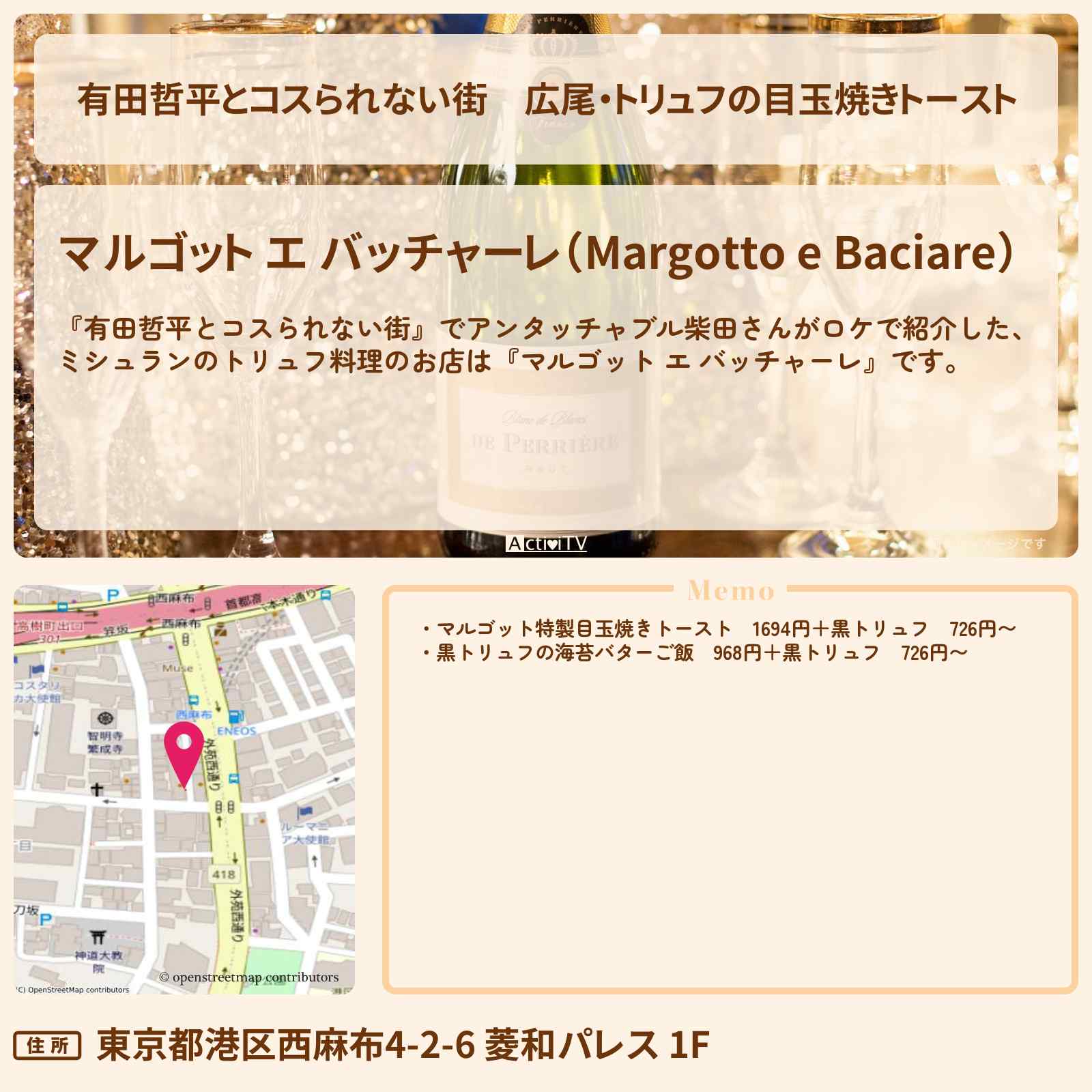 【有田哲平とコスられない街】広尾・トリュフの目玉焼きトースト『マルゴット エ バッチャーレ』ミシュラン掲載のお店の情報〔むにぐるめ・アンタッチャブル柴田〕