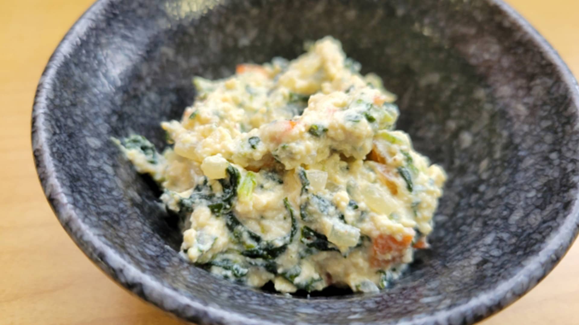 - あえ衣にさつまいも・ほうれんそう・厚揚げの表面の部分を半量加えてあえる