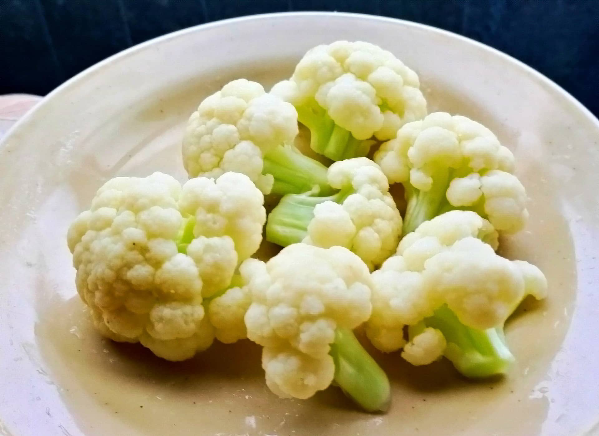 - カリフラワーの切り口以外の部分に薄く小麦粉をふり、肉ダネを貼り付ける