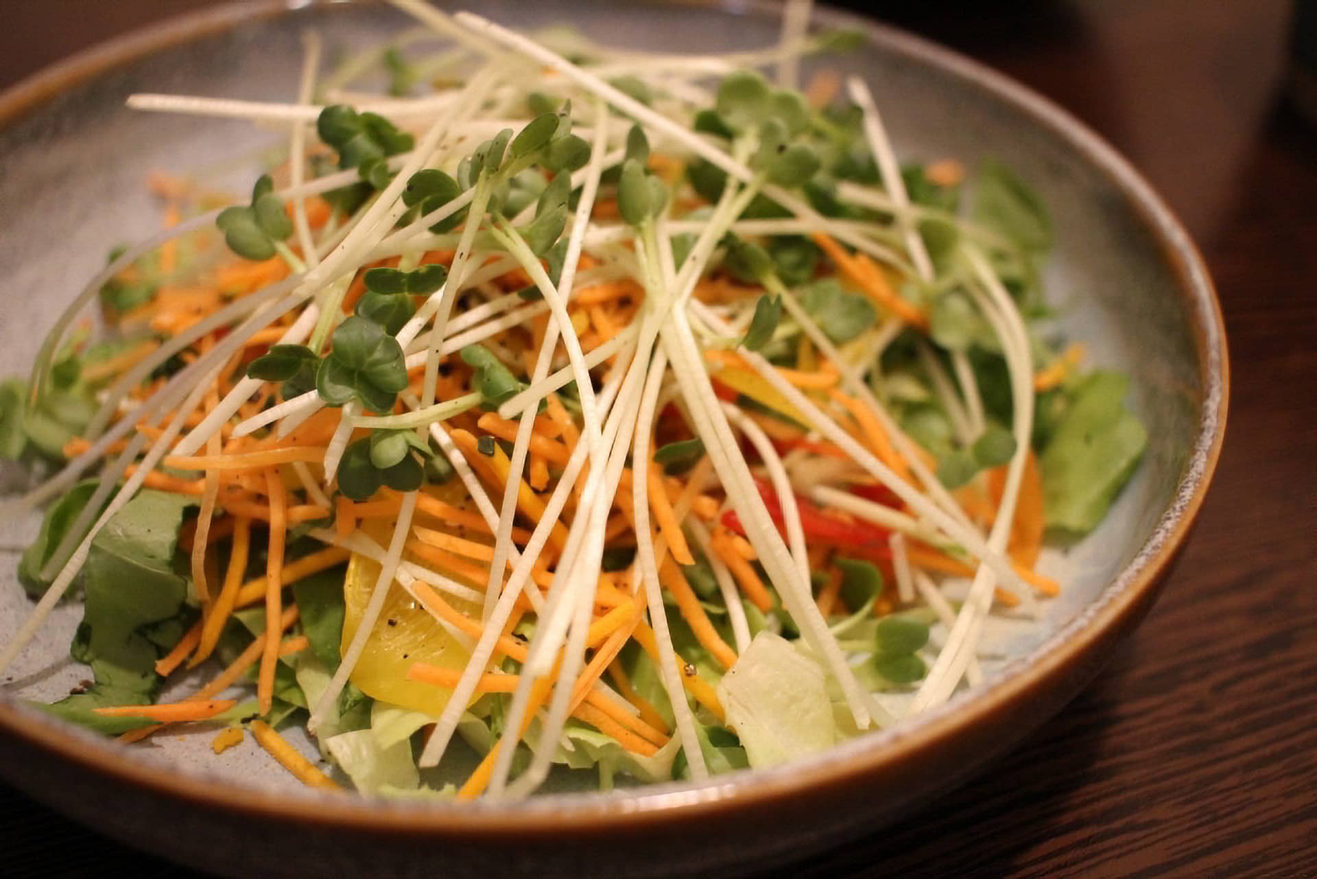 - ボウルに入れる。<ドレッシング用調味料>を加えてよく混ぜ、スプラウトとかにかまぼこも加えて軽く混ぜる