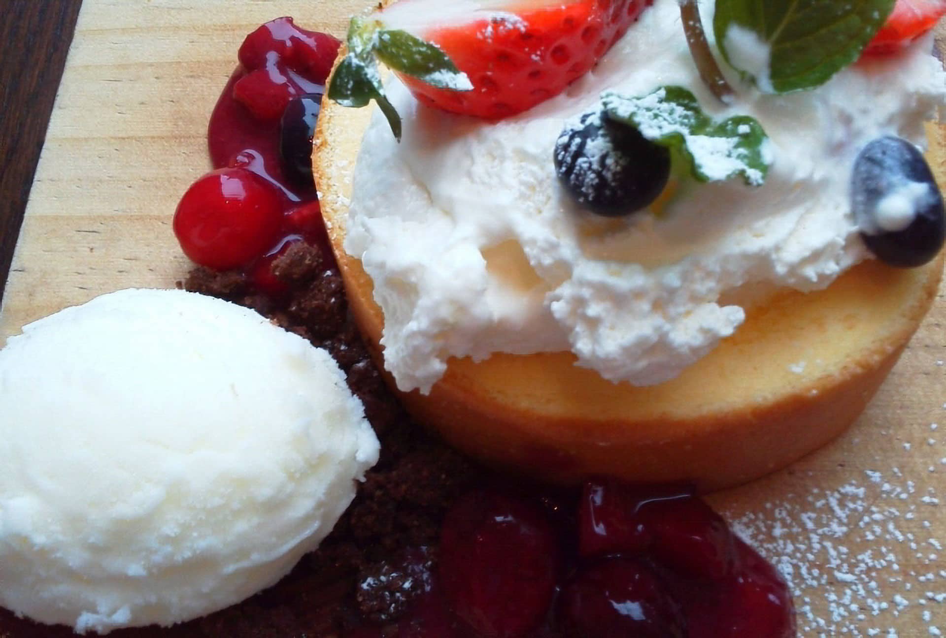 スポンジを市販のロールケーキで代用し、ボウルを型にしてお好みのフルーツとアイスを敷き詰めて作る簡単ケーキ。