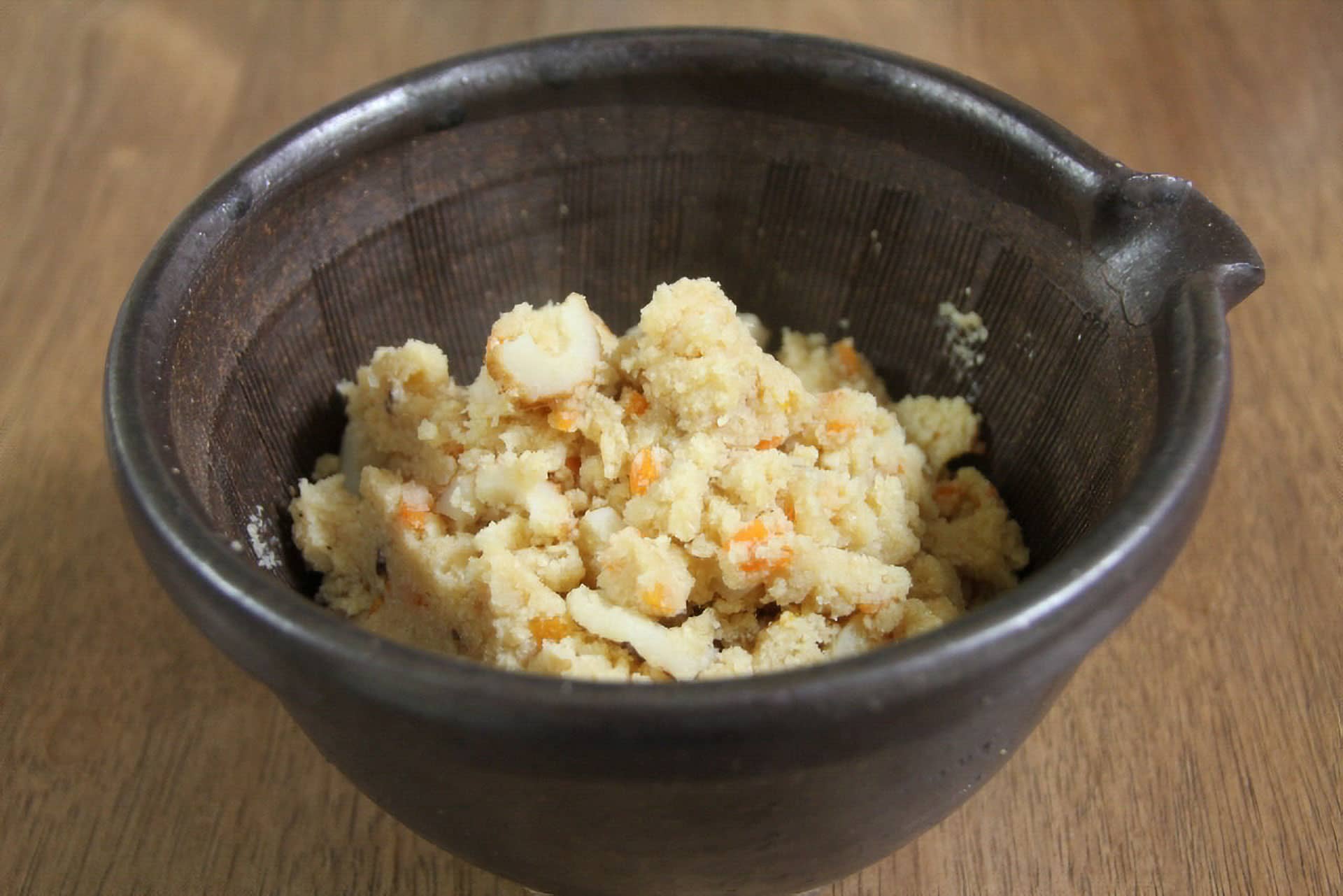 - クリームチーズ・白みそをボウルに入れ、トロリとするまでだしを加えて溶きのばす