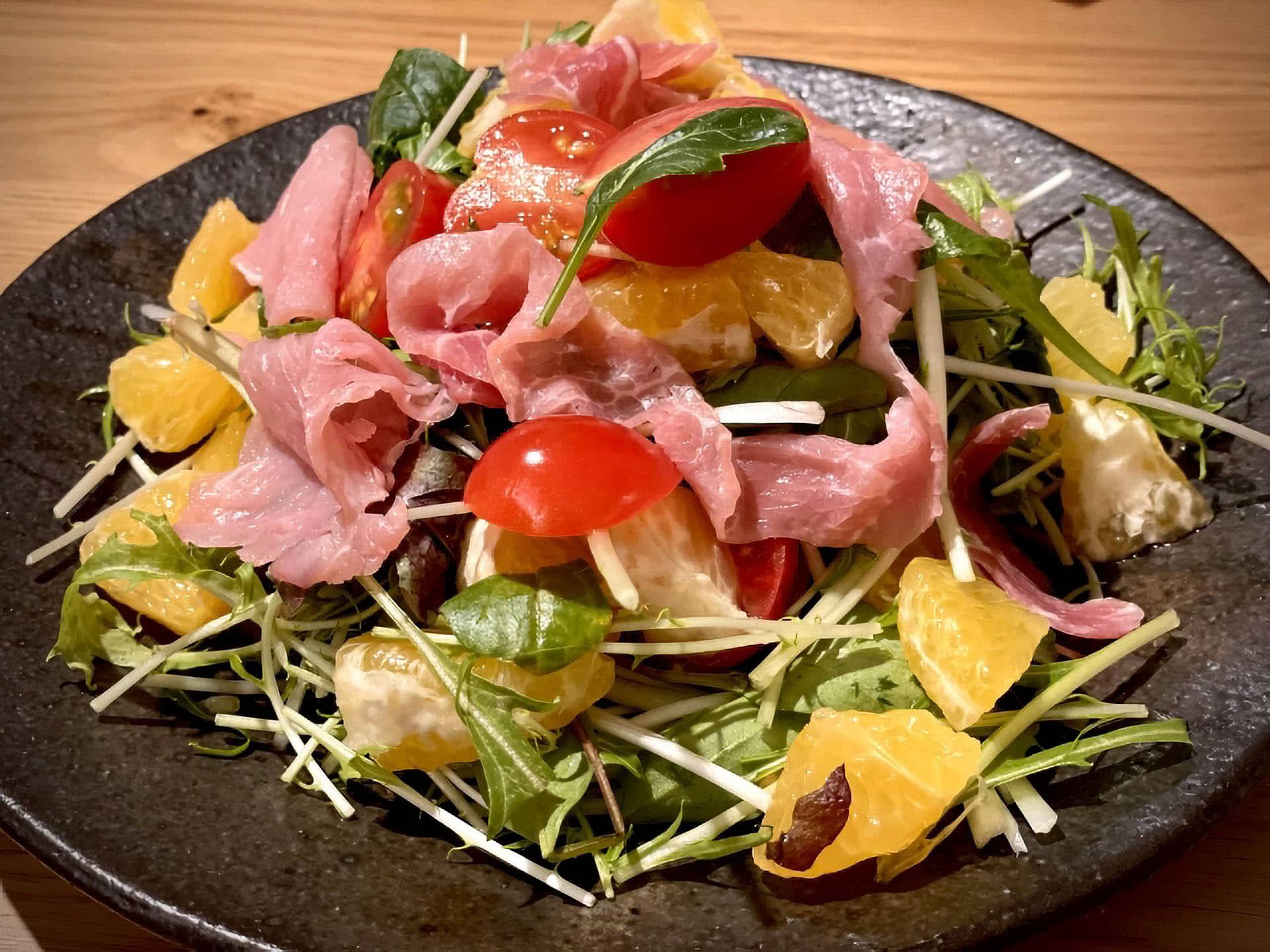 フレッシュなオレンジの甘酸っぱさと、生ハムの塩気が絶妙にマッチし、見た目も楽しめるサラダです。