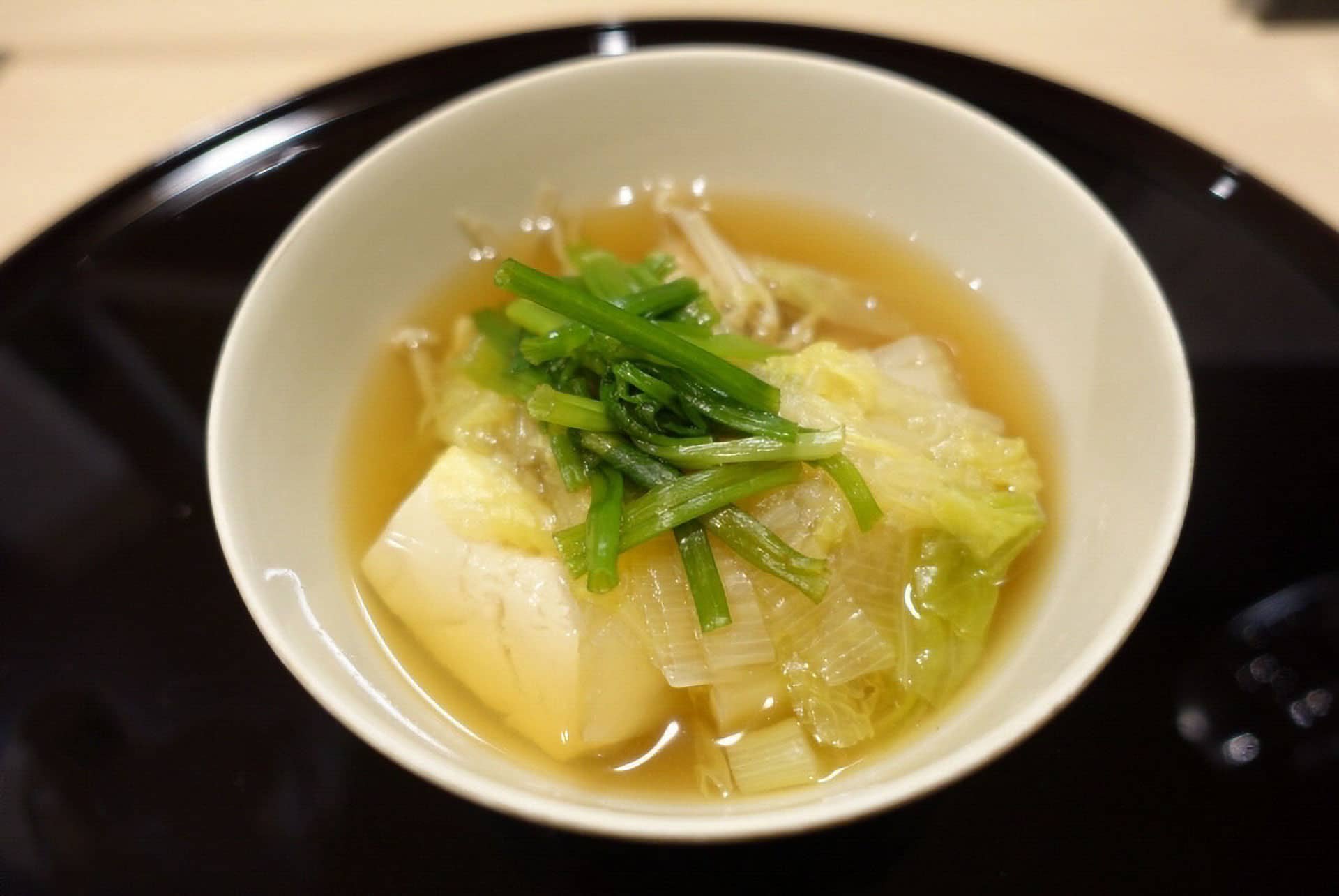 - 強火にかけて煮立たせ、中火にして5分間ほど、豆腐が温まってキャベツがしんなりとするまで煮る