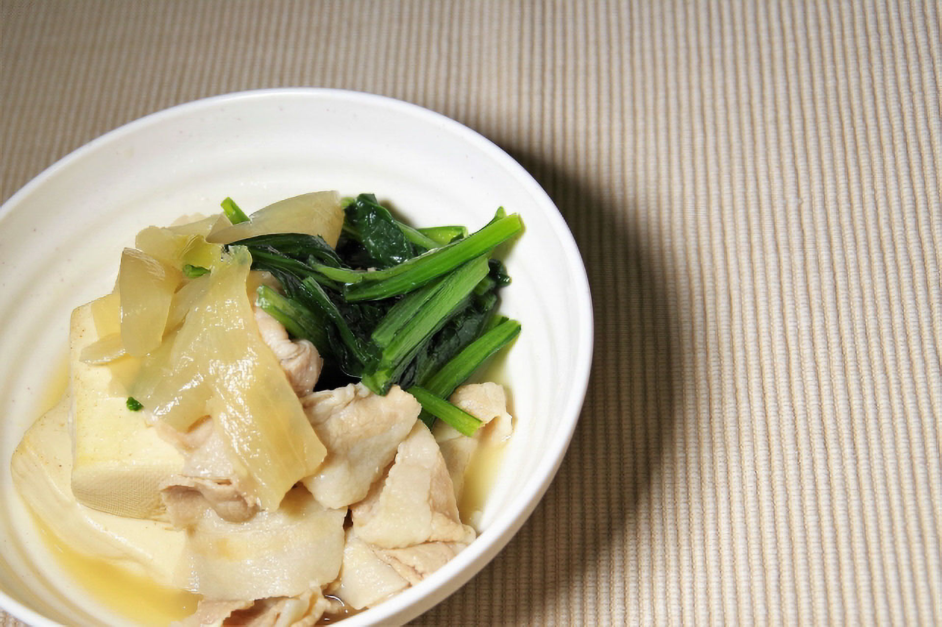 柔らかい木綿豆腐とジューシーな鶏もも肉を使った、体を温めるヘルシーな一品です。春菊と生しいたけが加わり、栄養バランスも抜群。昆布と醤油でじっくり煮込むことで、素材の旨味が溶け出し、深い味わいに。