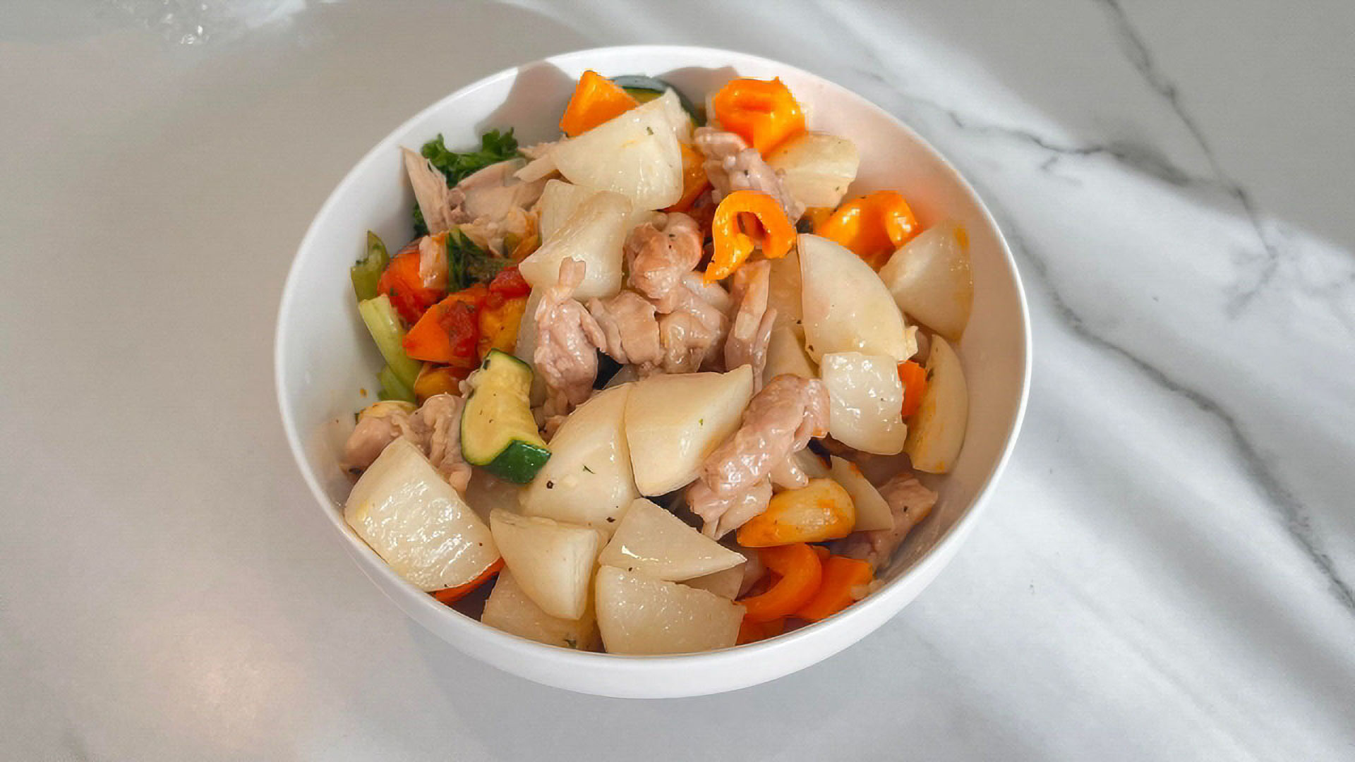 - 野菜から水分が出たら鶏肉を加え、水(大2)を回し入れてサッと炒める