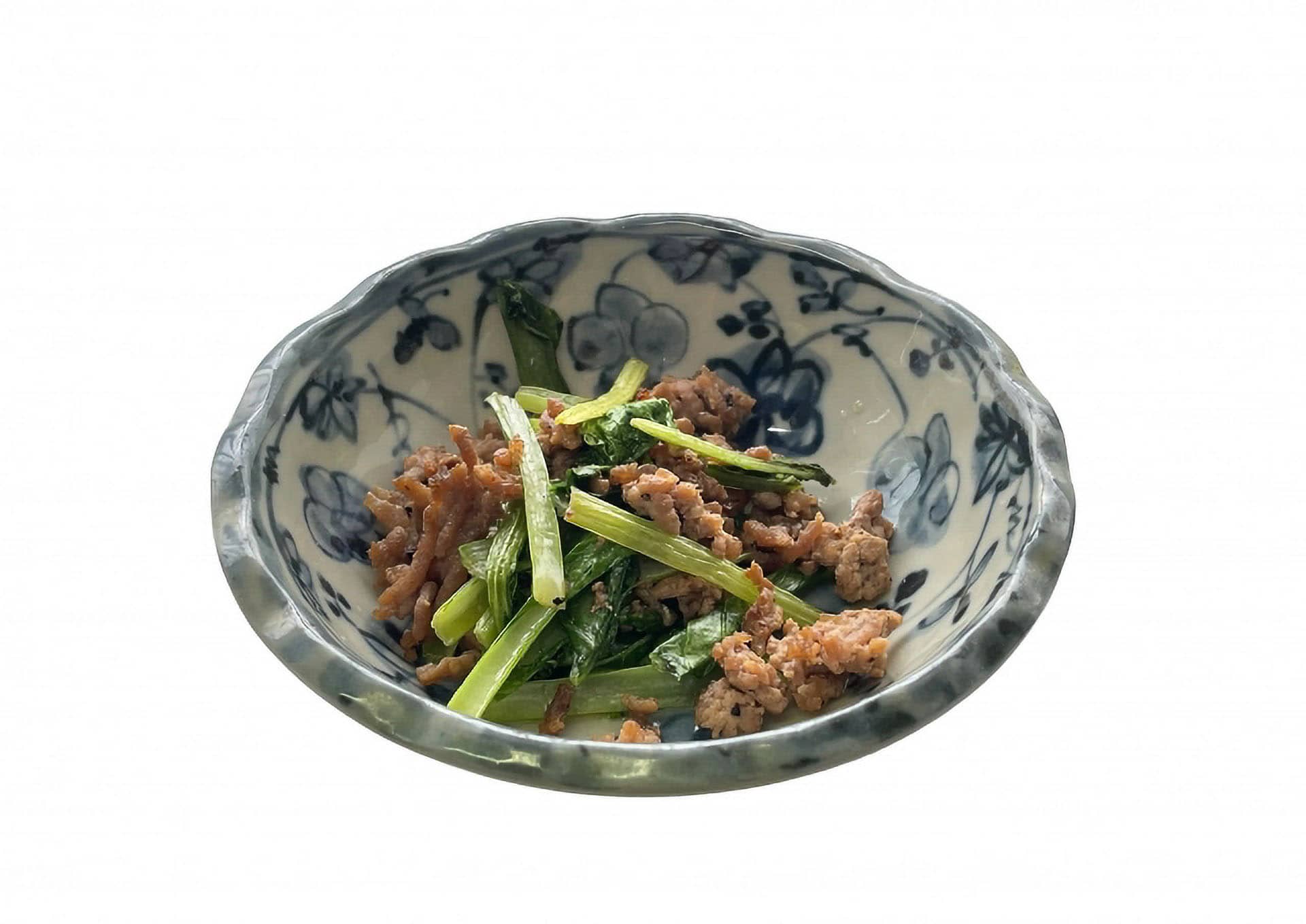 豚ひき肉の旨味と小松菜のシャキシャキ感が絶妙にマッチし、めんつゆの風味が食欲をそそります。桜えびのアクセントがこの料理の隠し味。