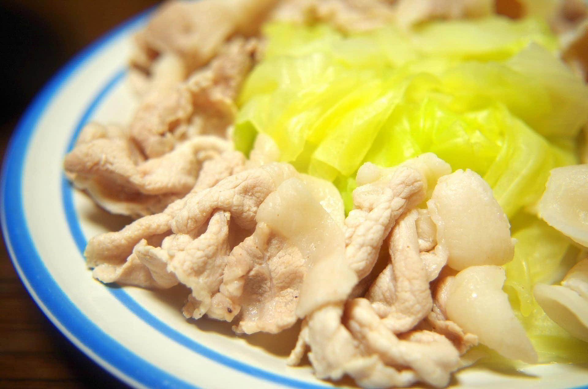 - 鍋に湯を沸かし、豚肉をゆでて火を通しす
