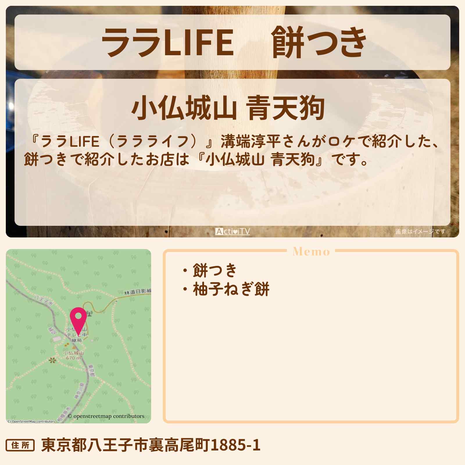 放送の【ララLIFE(ララライフ)】溝端淳平さんがロケで紹介した、餅つきで紹介したお店は『小仏城山 青天狗』です。