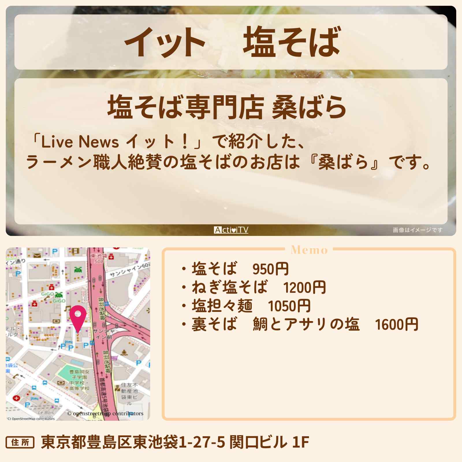 放送の「Live News イット!」で紹介した、ラーメン職人絶賛の塩そばのお店は『桑ばら』です。