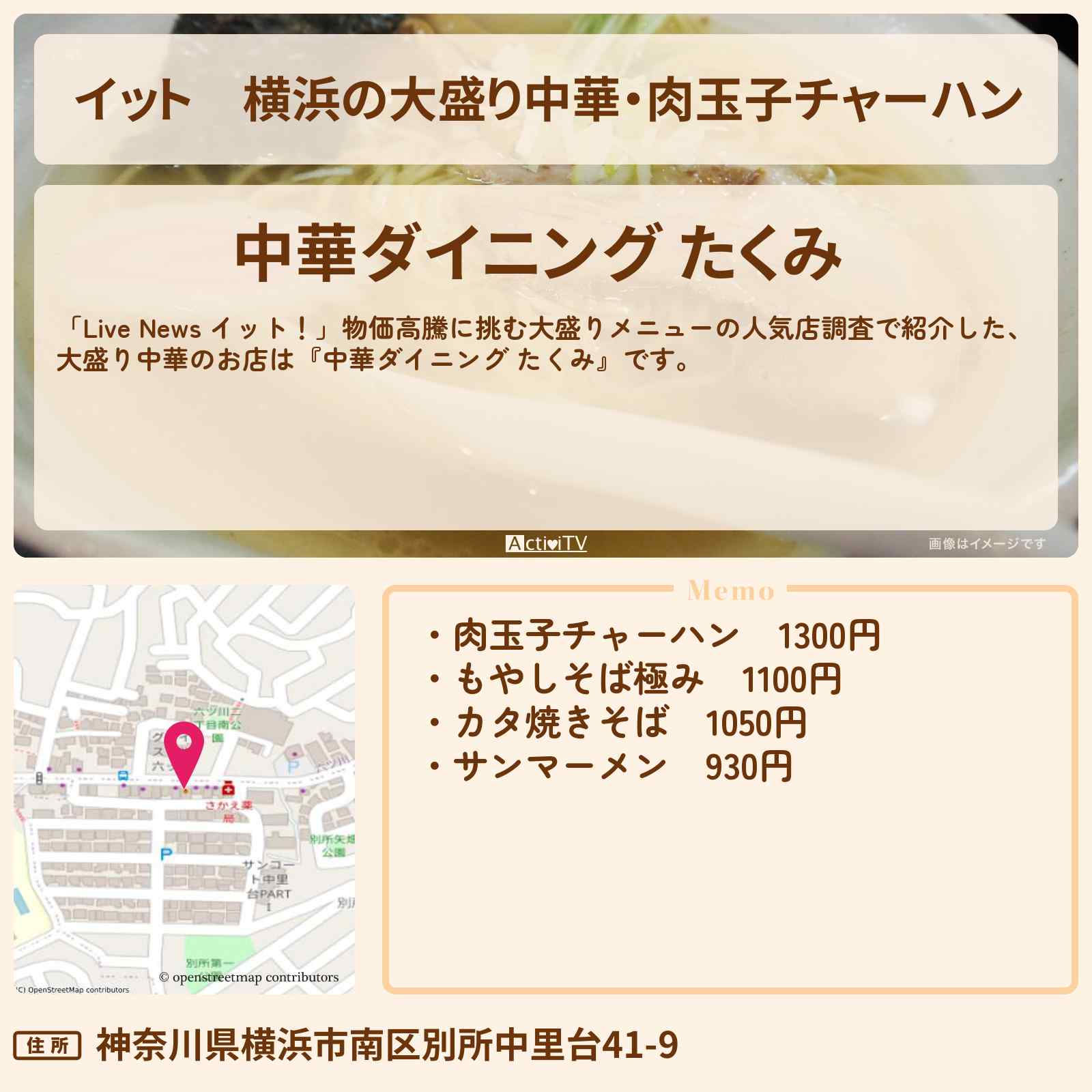 中華ダイニング たくみは横浜発祥のサンマーメンを全国へをモットーに日々進化するお店。並んで横浜発祥のタンメンもバランスのとれたスープで仕上げる絶品の一品!!是非食べて頂きたい!!…