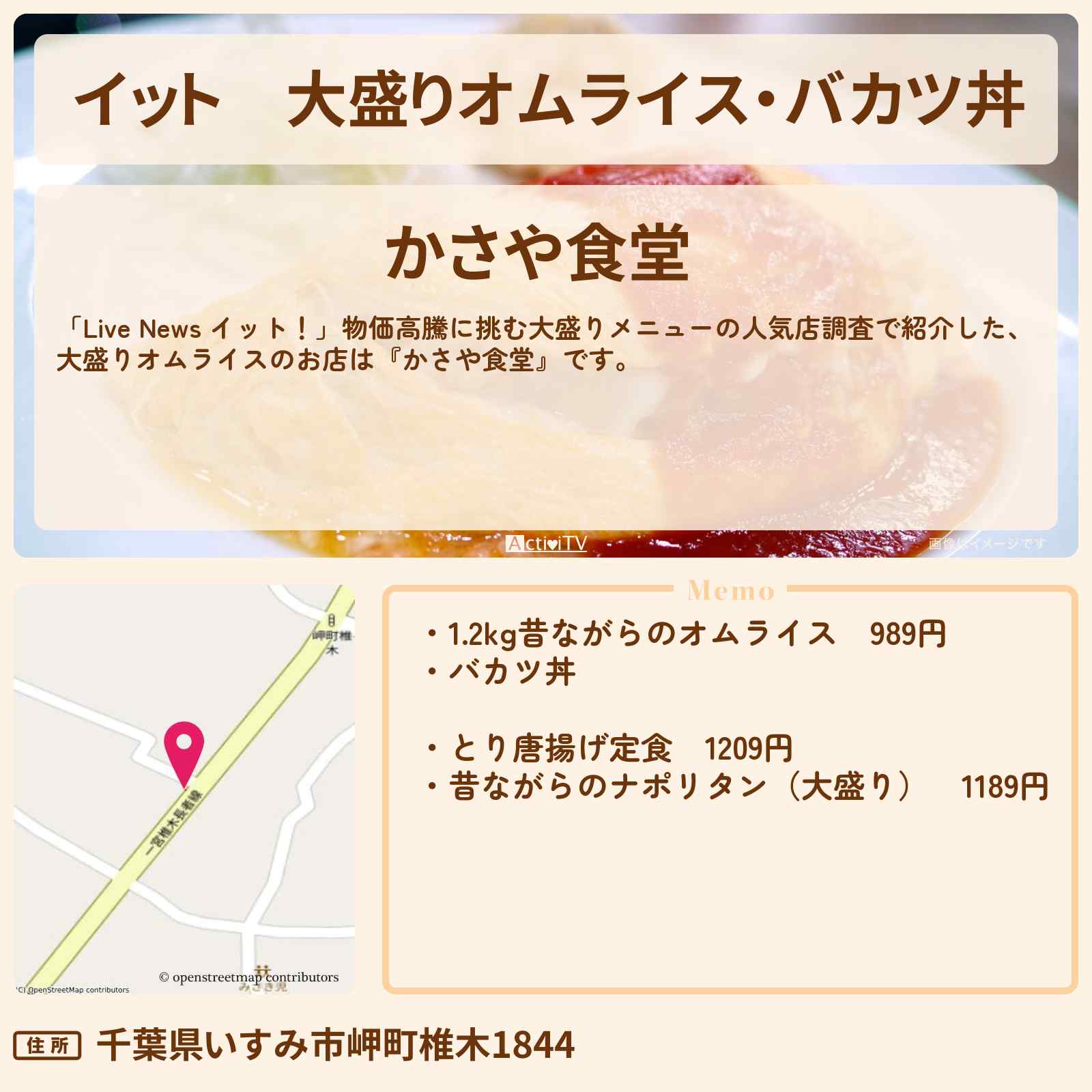 【イット】大盛りオムライス・バカツ丼『かさや食堂』千葉県いすみ市の大盛りの聖地・お店の場所