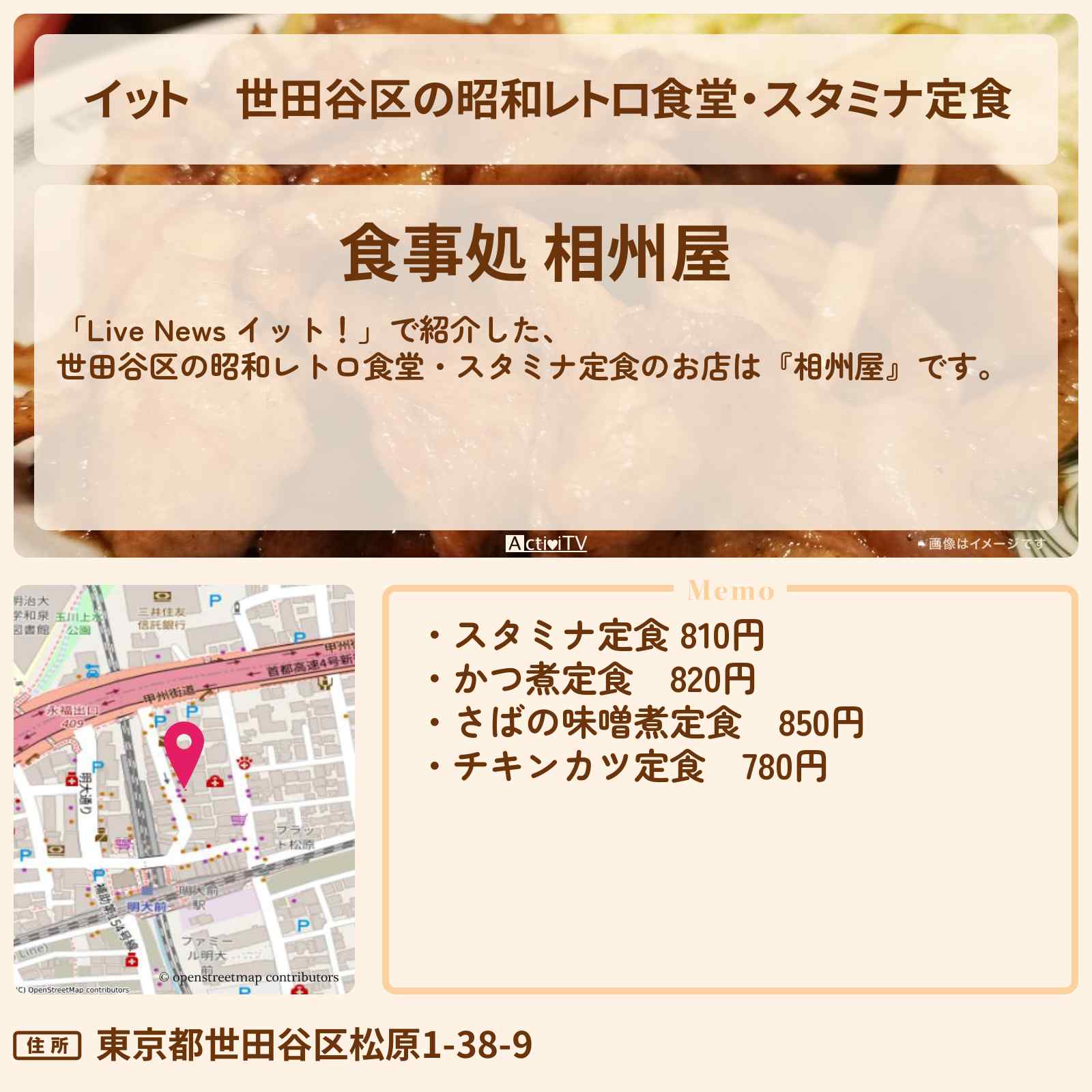 放送の「Live News イット!」で紹介した、世田谷区の昭和レトロ食堂・スタミナ定食のお店は『相州屋』です。