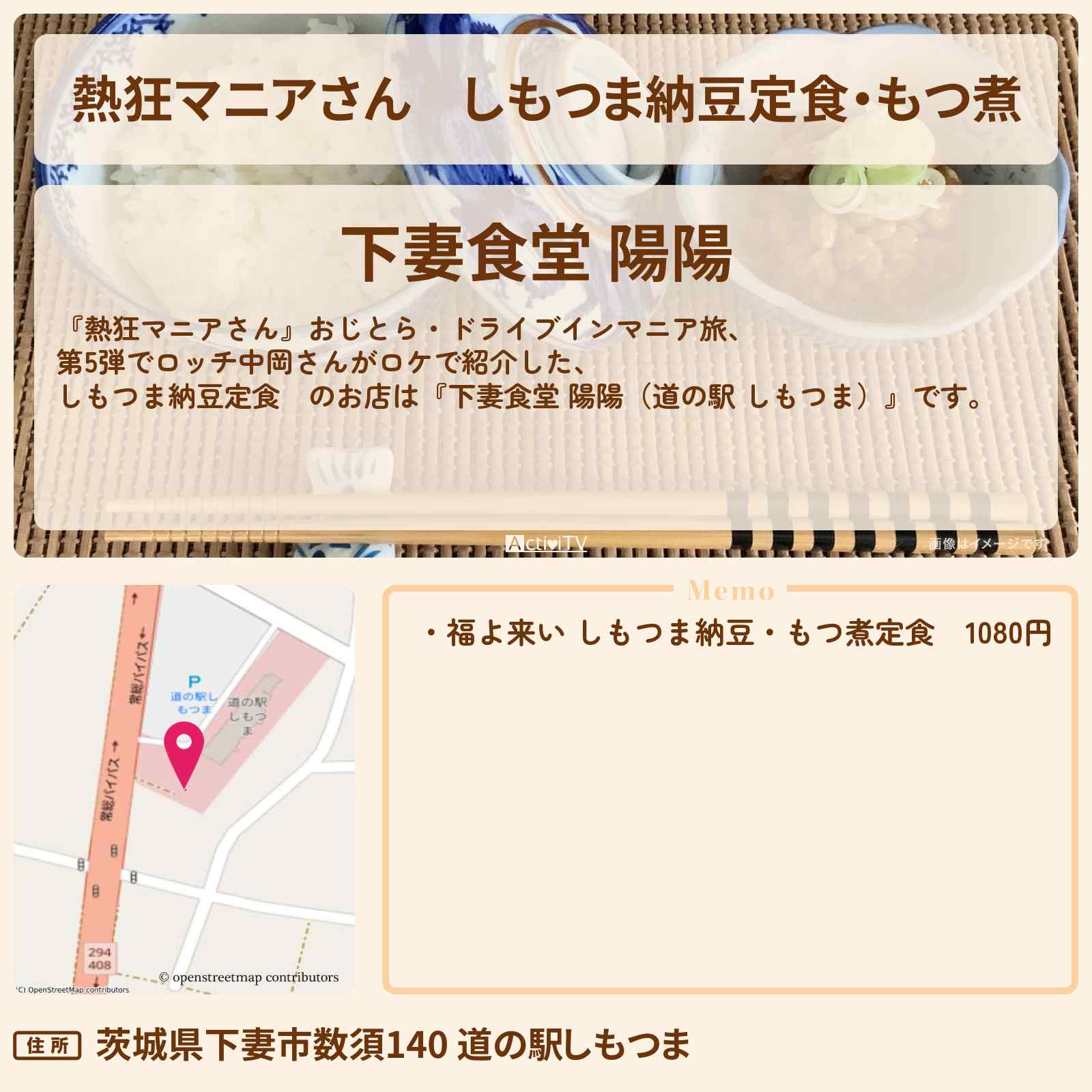 | 住所 | 茨城県下妻市数須140 道の駅しもつま |