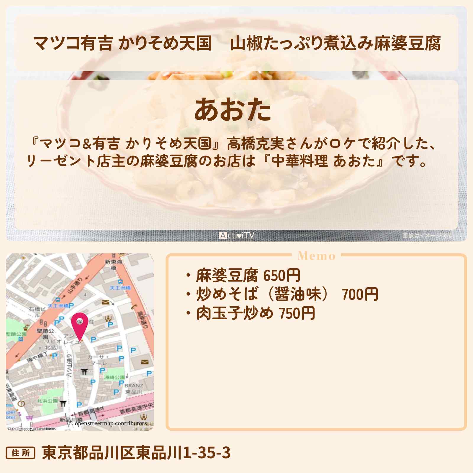 放送の【マツコ&有吉 かりそめ天国】高橋克実さんがロケで紹介した、リーゼント店主の麻婆豆腐のお店は『中華料理 あおた』です。