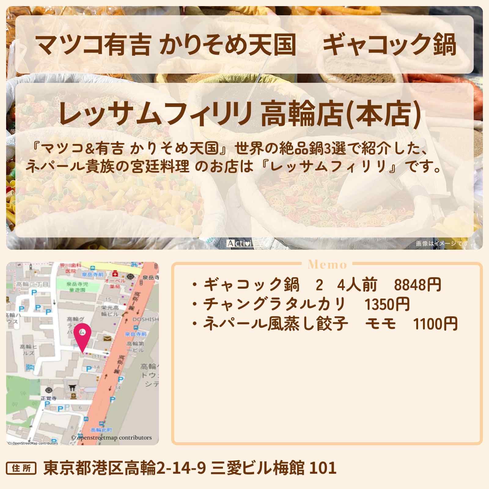 放送の【マツコ&有吉 かりそめ天国】世界の絶品鍋3選で紹介した、ネパール貴族の宮廷料理 のお店は『レッサムフィリリ』です。