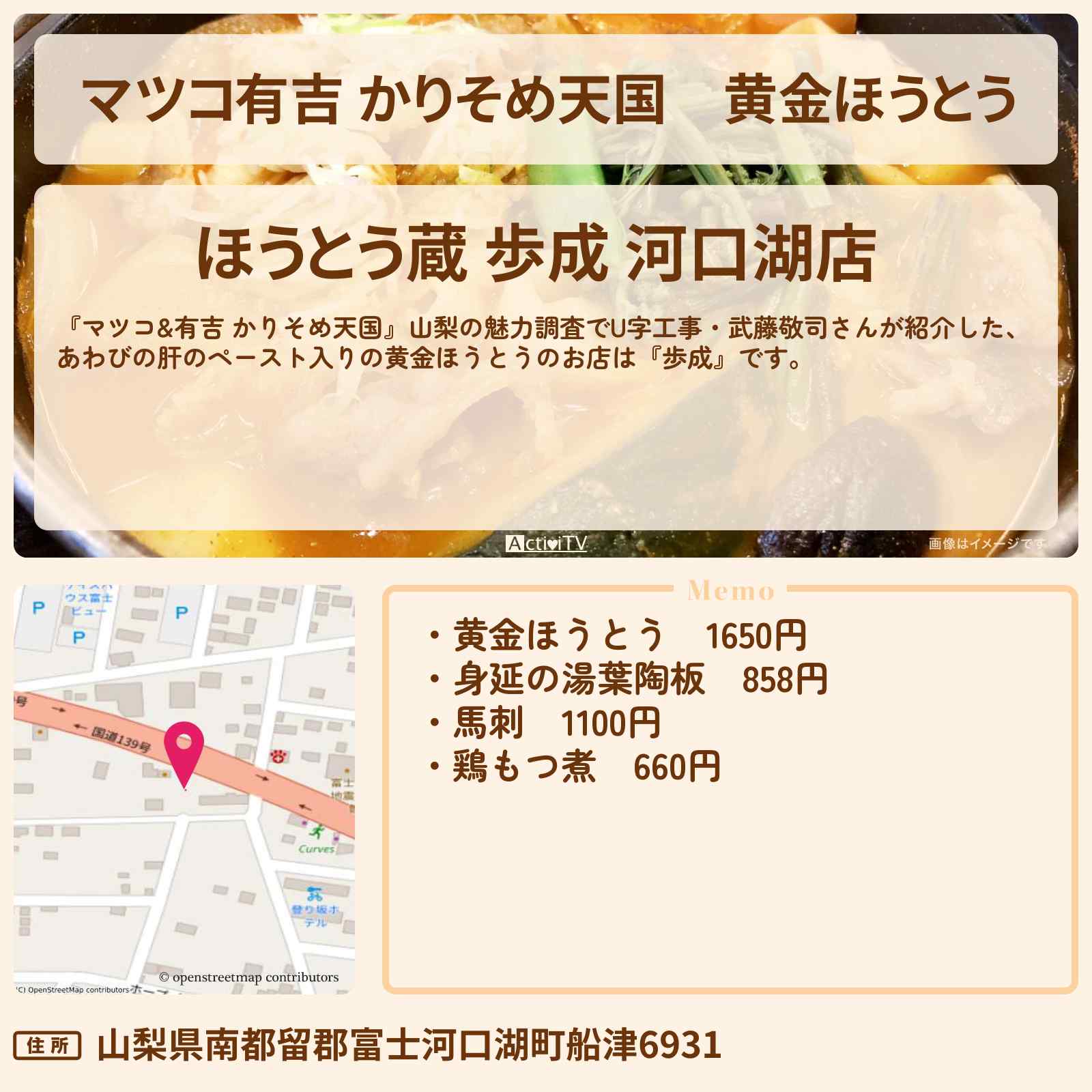放送の【マツコ&有吉 かりそめ天国】山梨の魅力調査でU字工事・武藤敬司さんが紹介した、あわびの肝のペースト入りの黄金ほうとうのお店は『歩成』です。