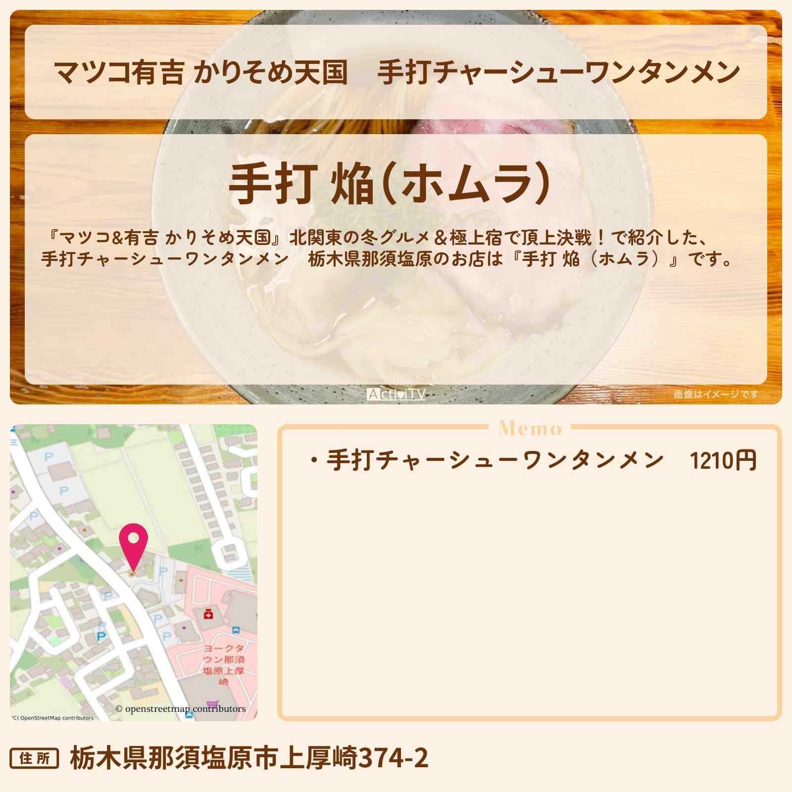 放送の【マツコ&有吉 かりそめ天国】北関東の冬グルメ&極上宿で頂上決戦!で紹介した、手打チャーシューワンタンメン 栃木県那須塩原のお店は『手打 焔(ホムラ)』です。