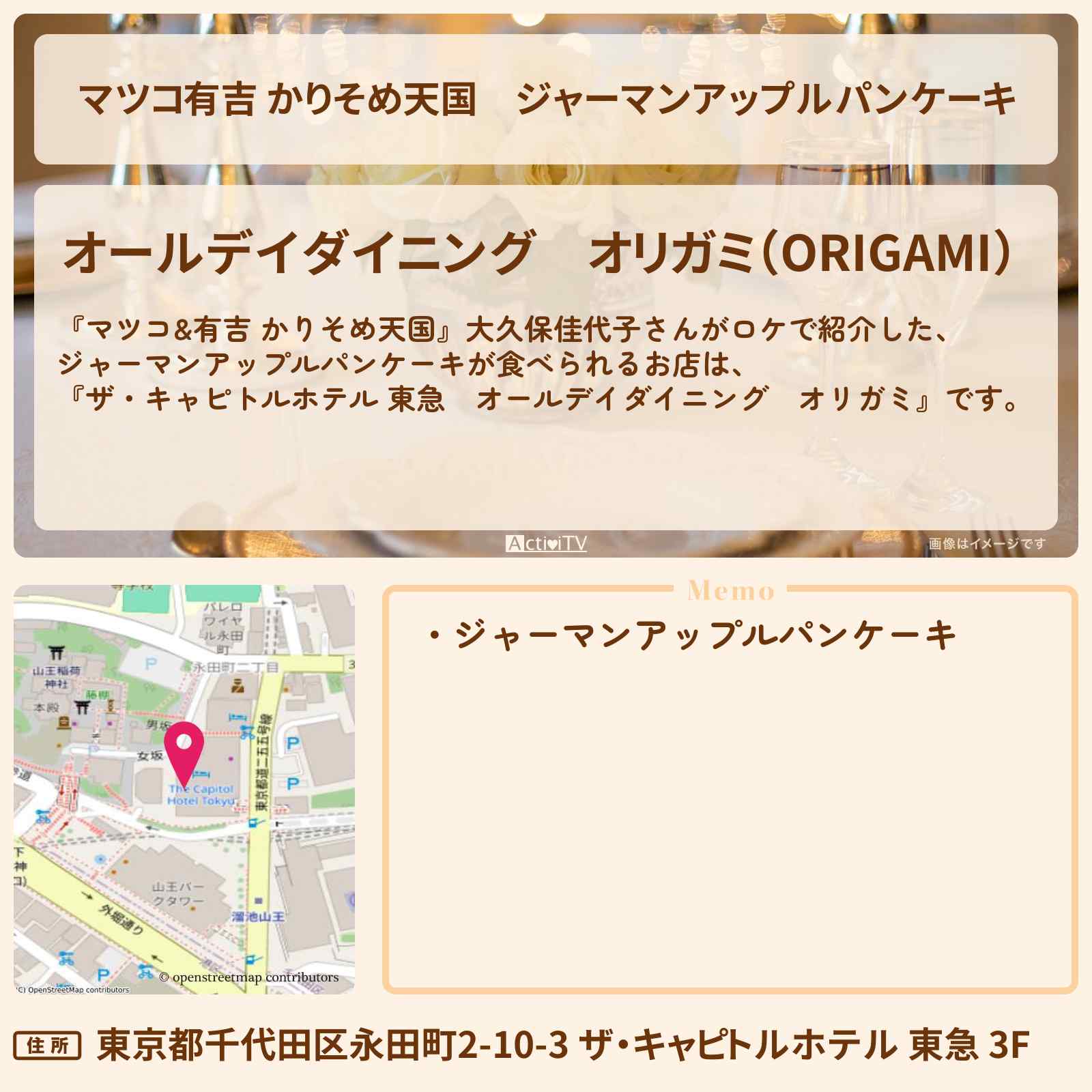 ジャーマンアップルパンケーキ 溜池山王駅「オールデイダイニング オリガミ(ORIGAMI)」