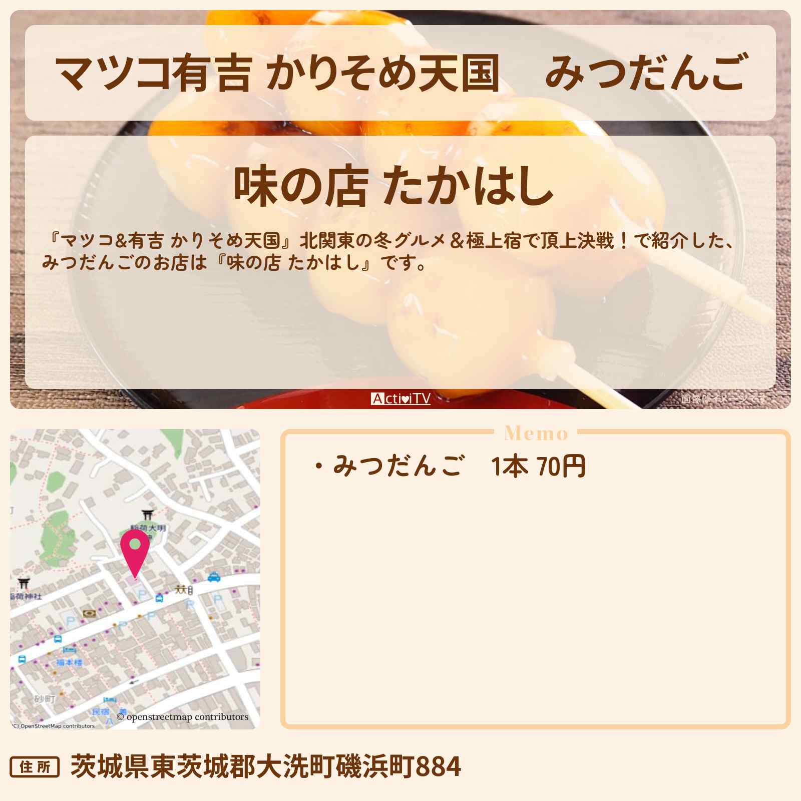 【マツコ有吉 かりそめ天国】みつだんご『味の店 たかはし』茨城県大洗のお店の場所〔大久保佳代子・黒沢かずこ〕