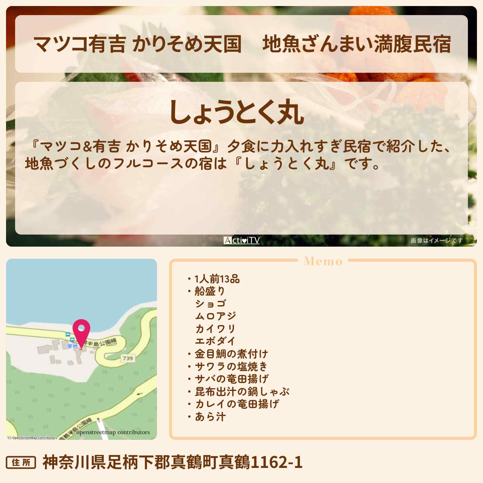神奈川県西部の豊かな森と海に囲まれた、さりげない風情が心に響く「美の町」真鶴。しょうとく丸は、半島北側の穏やかで透明感ある琴ヶ浜海岸を目の前にし、地元で獲れた新鮮な海の幸にこだわったお食事を楽しめる料理宿です。夫婦で営む全4室。我が家のように、ゆっくりとくつろいでいってね!しょうとく丸では、自家製干物と塩辛をつくっています、ご自宅でもしょうとく丸の味をぜひお楽しみください。…