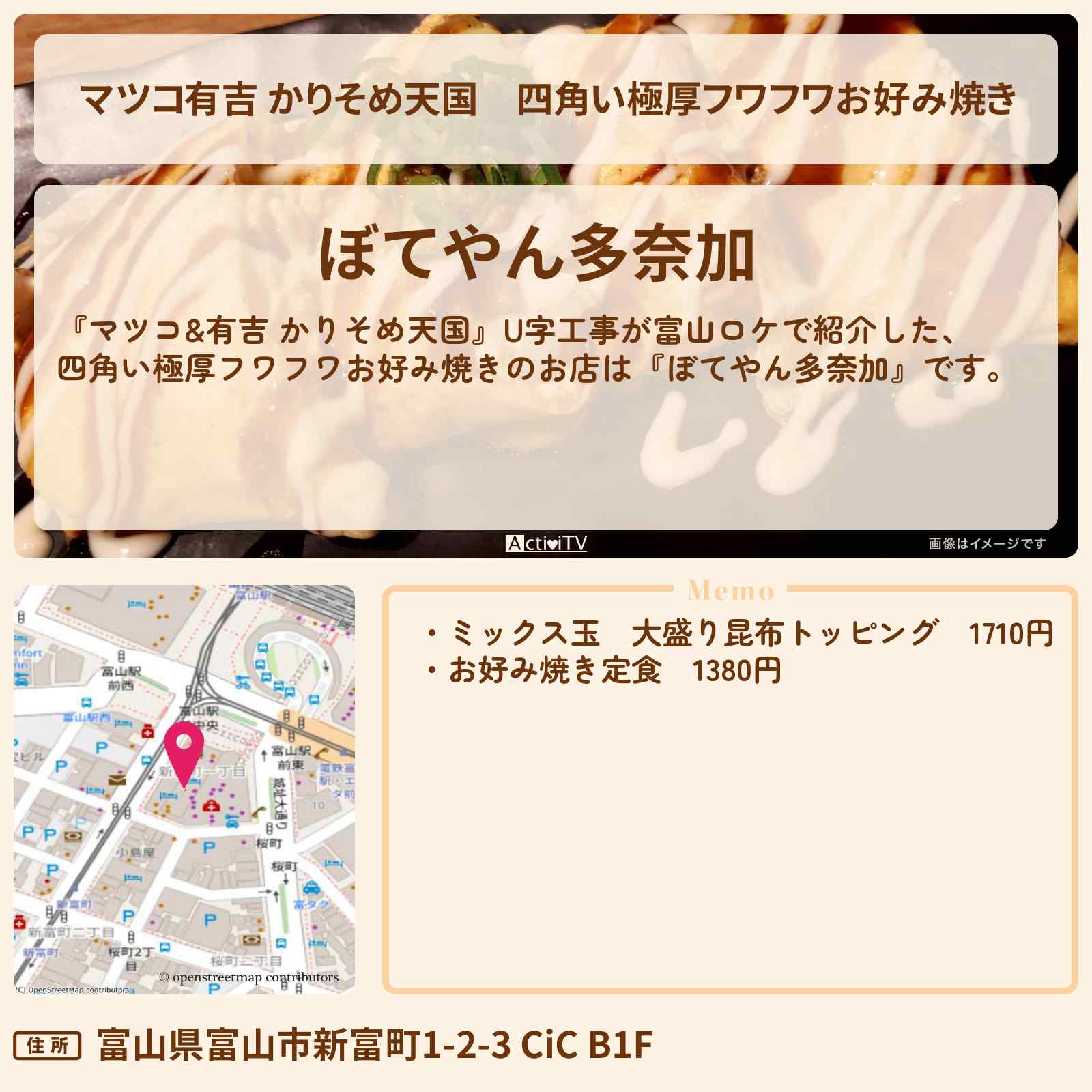 お好み焼き、焼きそば、モダン焼き、定食、ランチ etc…長年、富山駅前で愛されてきた「ぼてやん多奈加」四角いお好み焼きにクセになるマヨネーズが特徴です。 インターネット、メールでの御予約をお受けできません。 お持ち帰り商品のお受けは電話のみで行っておりますが、繋がりにくい時間帯がございますので、改めてお掛け下さい。…