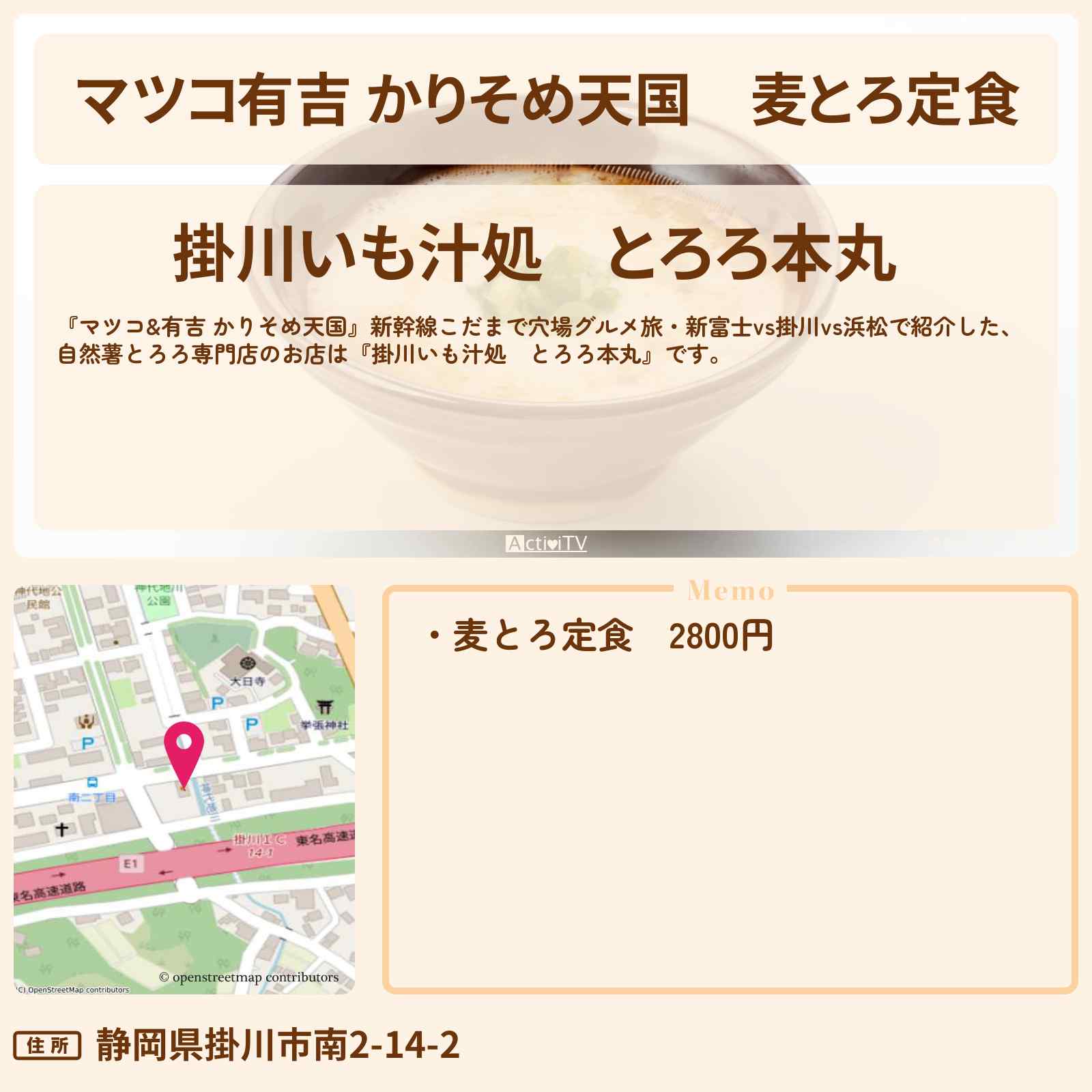 こちらは『掛川いも汁処 とろろ本丸(掛川市街/洋食)』のお店ページです。実名でのオススメが2件集まっています。Rettyで食が好きなグルメな人たちからお店を探そう!…