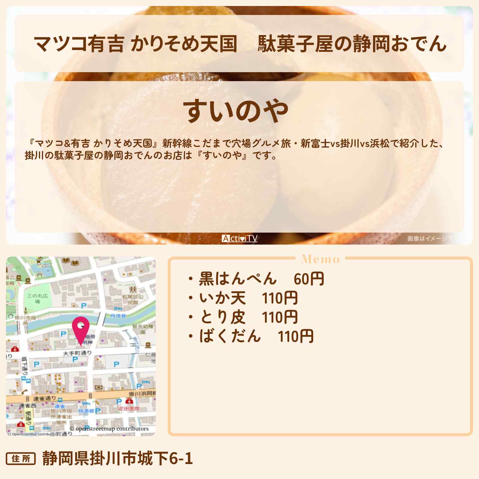 すいのや(掛川/その他グルメ/軽食・その他グルメ)の店舗情報・予約なら、お得なクーポン満載【ホットペッパーグルメ】!すいのやのおすすめポイントは、皆に愛されるお店の看板おばあちゃんはなんと83歳!そろばん片手にお店に立つそのシャキッとした姿は必見! 大人も思わず子供目線になってしまう。子供はもちろん、目を輝かせて買っていく大人の方も多い☆。すいのやの地図、メニュー、口コミ、写真などグルメ情報満載です!…