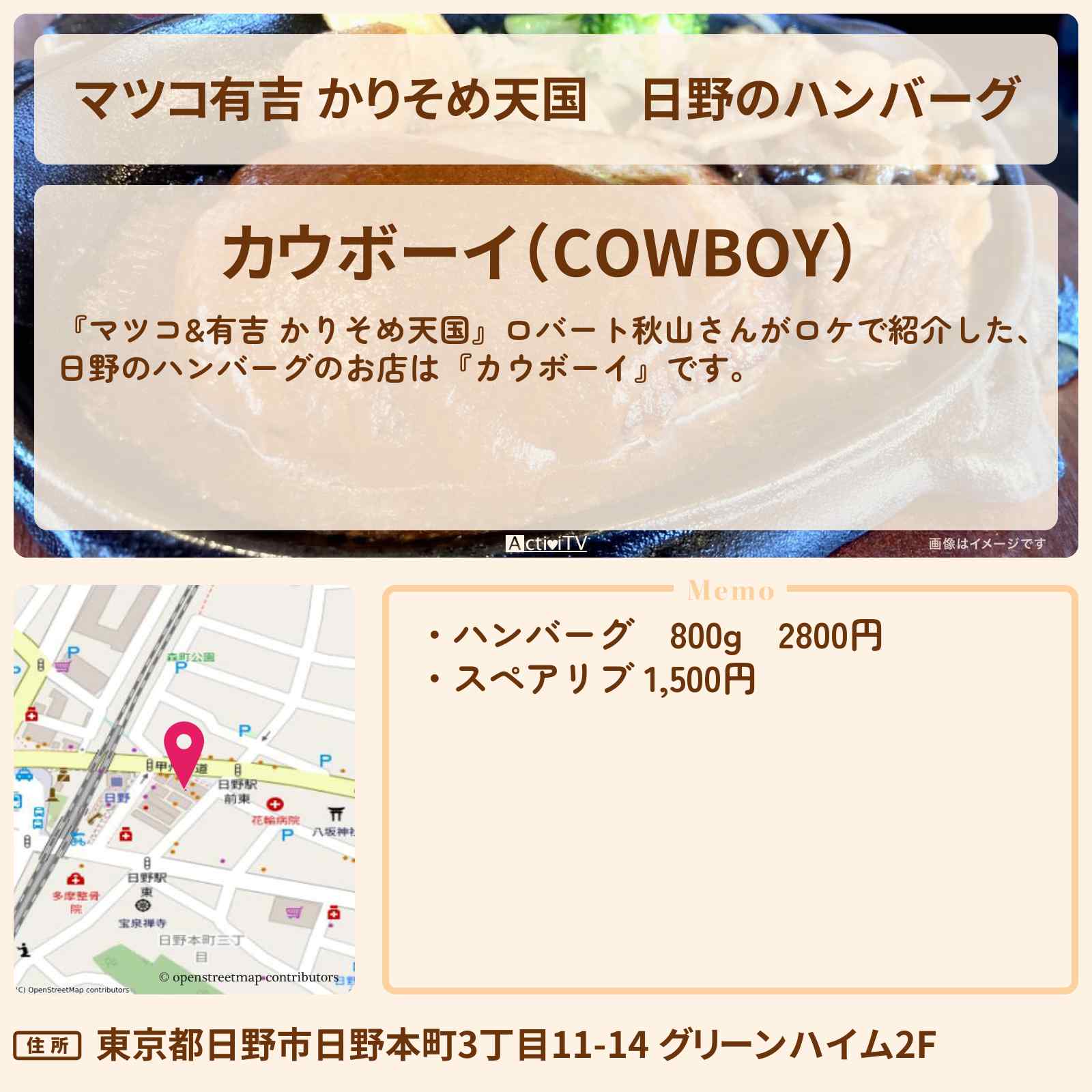 放送の【マツコ&有吉 かりそめ天国】ロバート秋山さんがロケで紹介した、日野のハンバーグのお店は『カウボーイ』です。