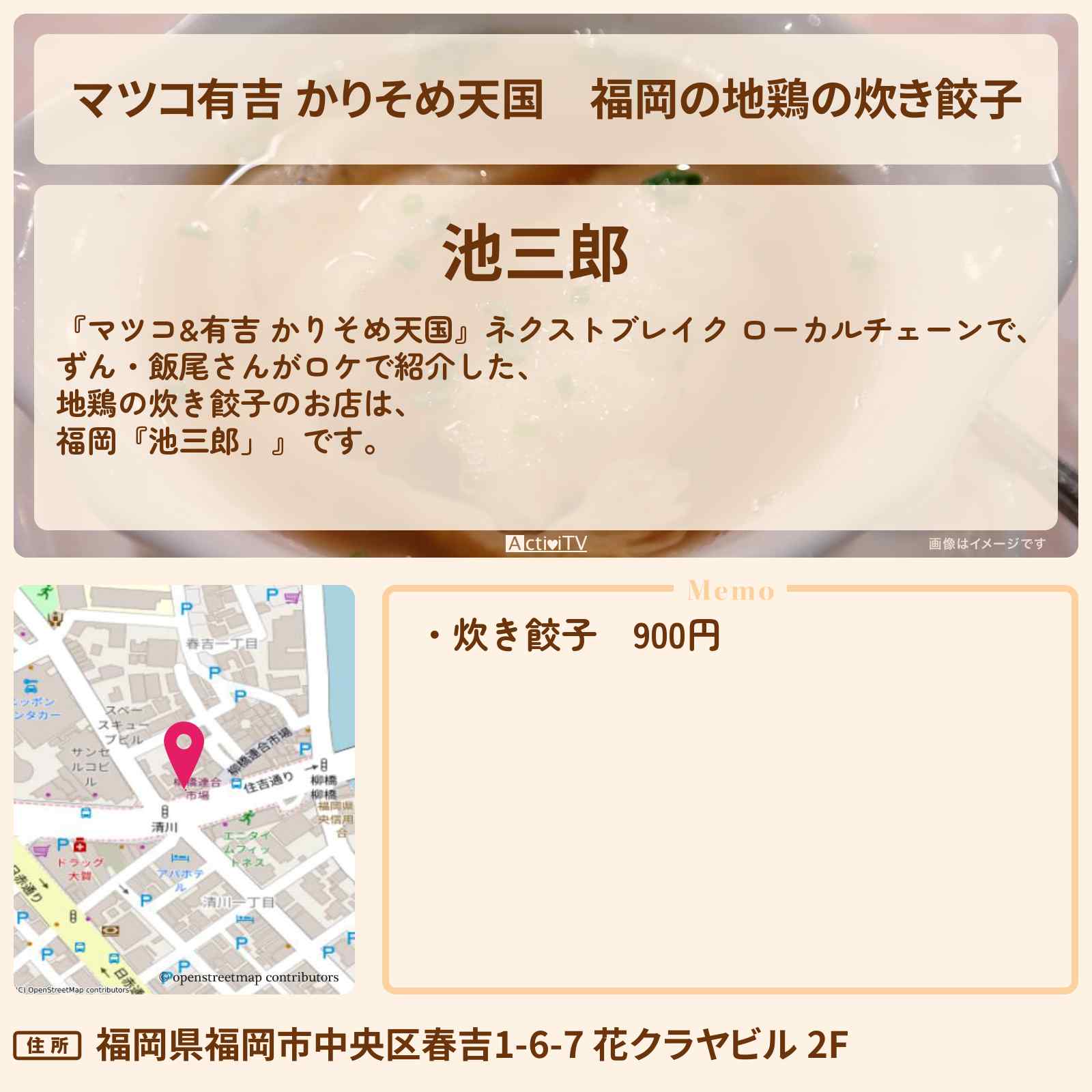 お店は、福岡の新しいソウルフードといわれる炊き餃子を生み出した池田商店グループの一員で、池田商店、池田屋、池ぽんと合わせて4店舗を展開しています。