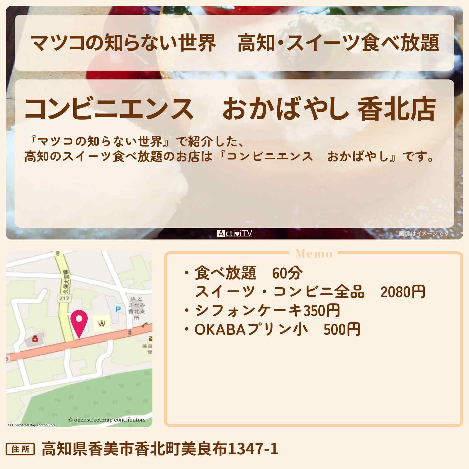 放送の【マツコの知らない世界】で紹介した、高知のスイーツ食べ放題のお店は『コンビニエンス おかばやし』です。