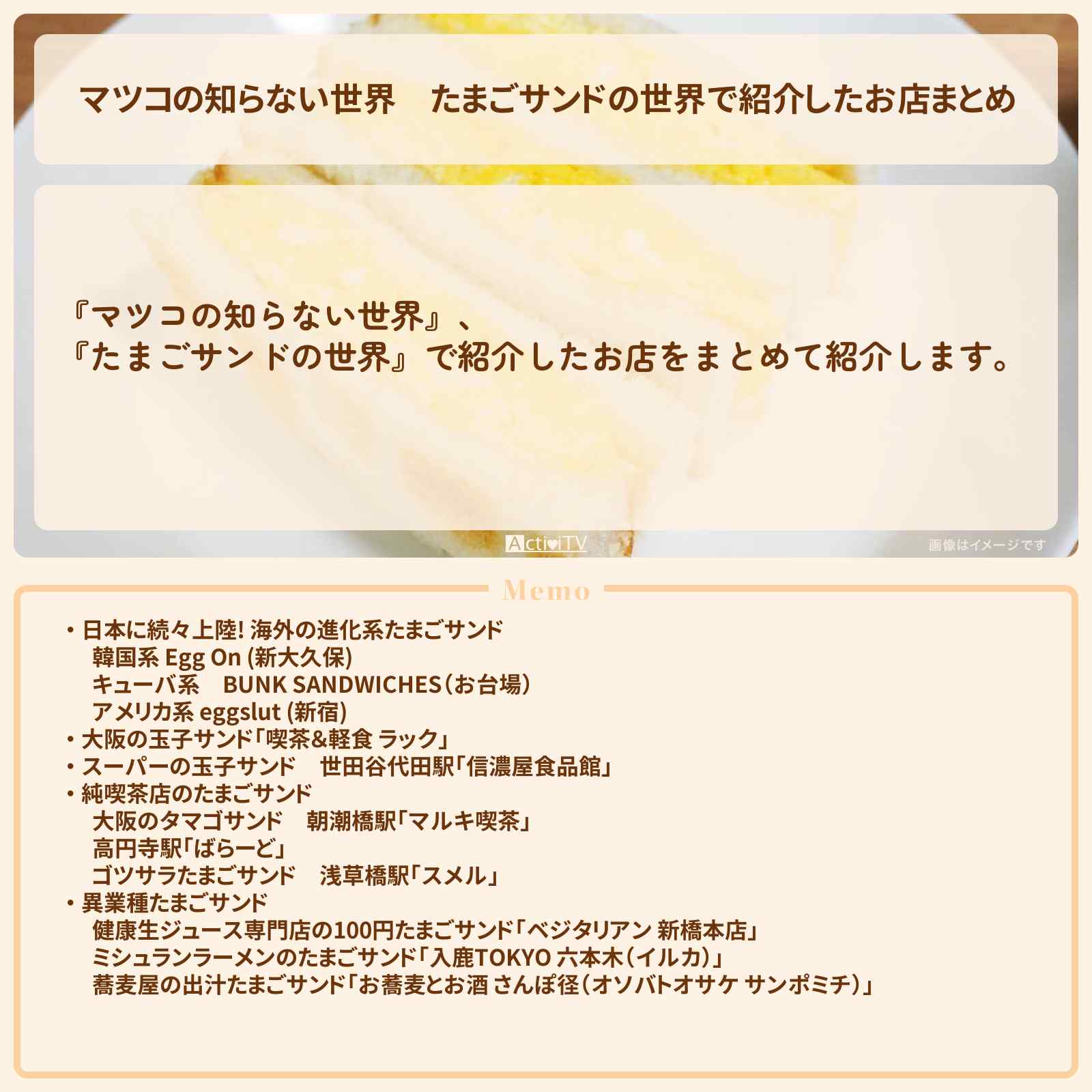 人気が、塩のみで味付けした薄焼き卵とスクランブルエッグの2種セットしたタマゴサンドです。番組では裏メニューの薄焼き卵と、粗めにカットした茹でたまごと、マヨネーズのゴツゴツのたまごサラダのゴツサラが紹介されました。