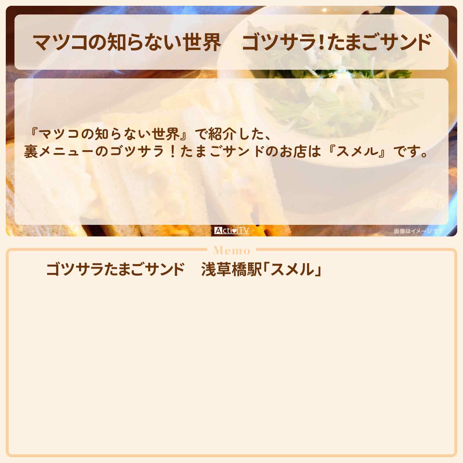 放送の【マツコの知らない世界】で紹介した、裏メニューのゴツサラ!たまごサンドのお店は『スメル』です。