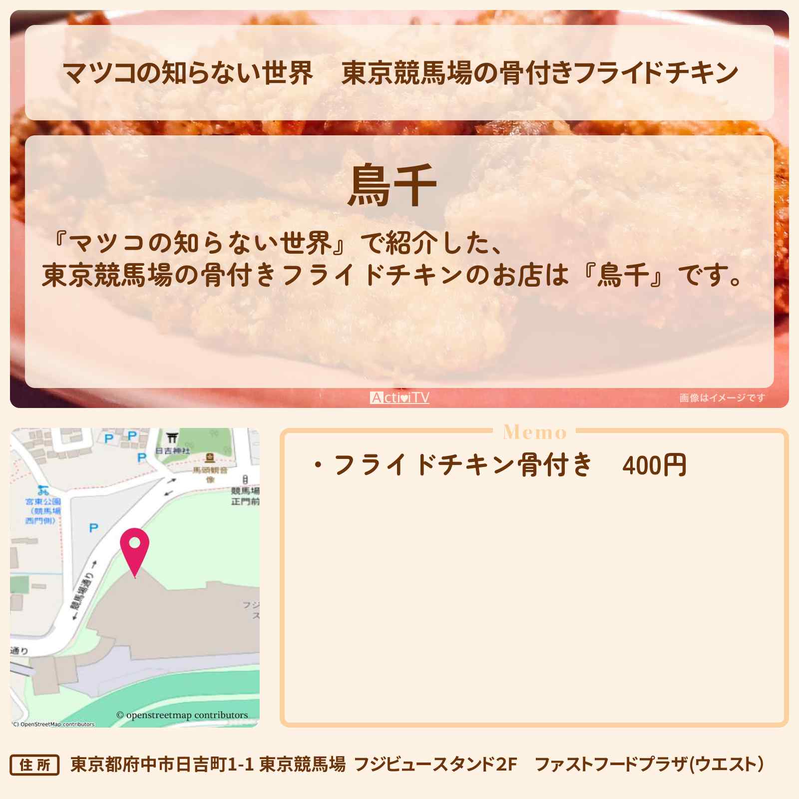 放送の【マツコの知らない世界】で紹介した、東京競馬場の骨付きフライドチキンのお店は『鳥千』です。