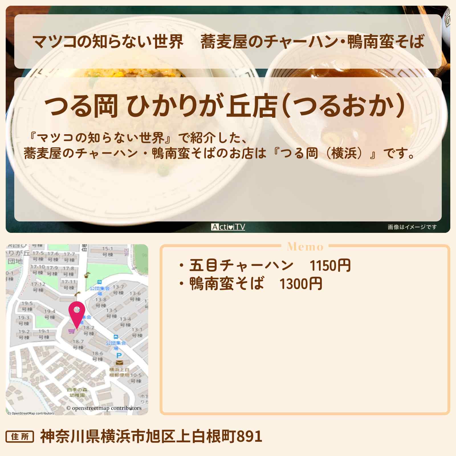 放送の【マツコの知らない世界】で紹介した、蕎麦屋のチャーハン・鴨南蛮そばのお店は『つる岡(横浜)』です。