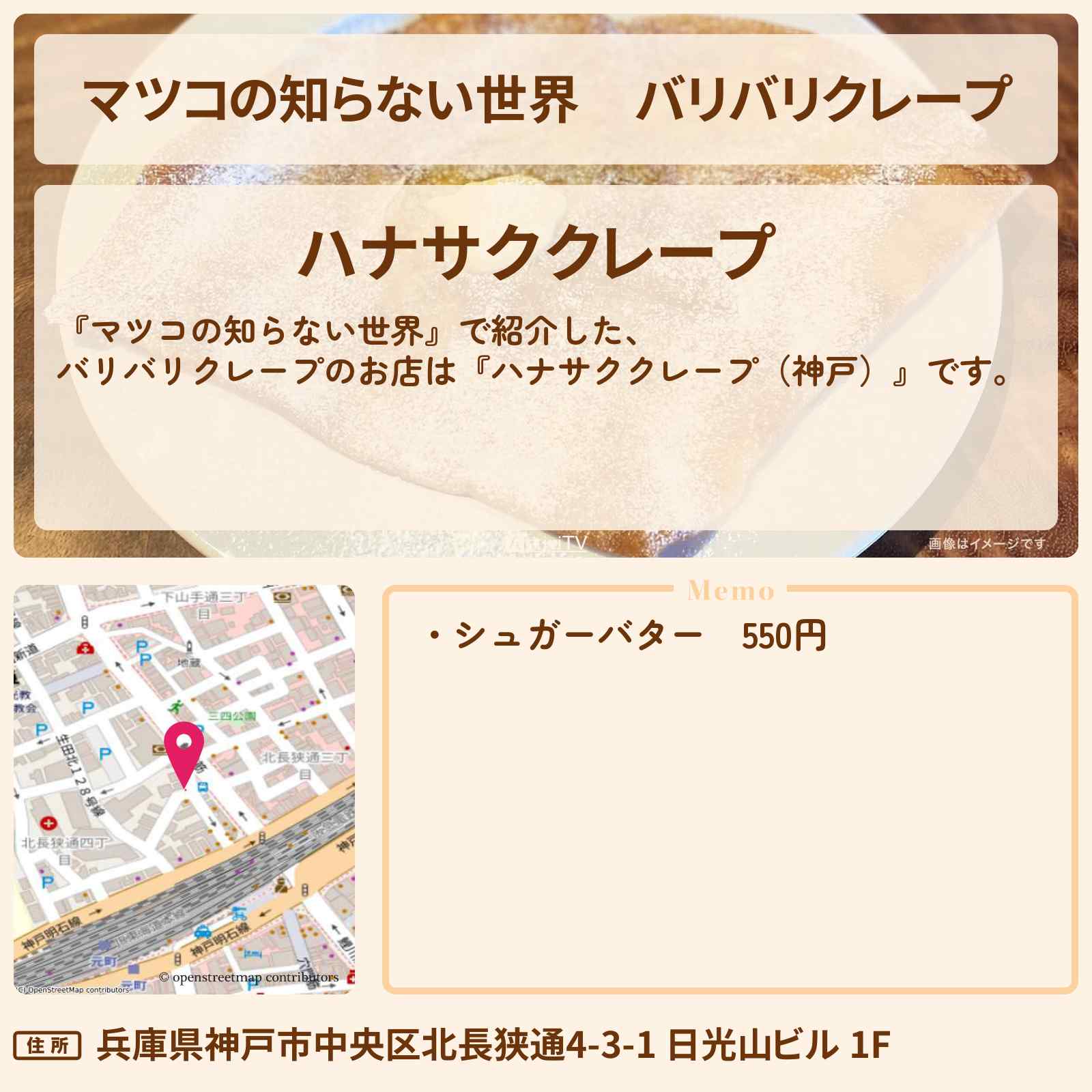 放送の【マツコの知らない世界】で紹介した、バリバリクレープのお店は『ハナサククレープ(神戸)』です。
