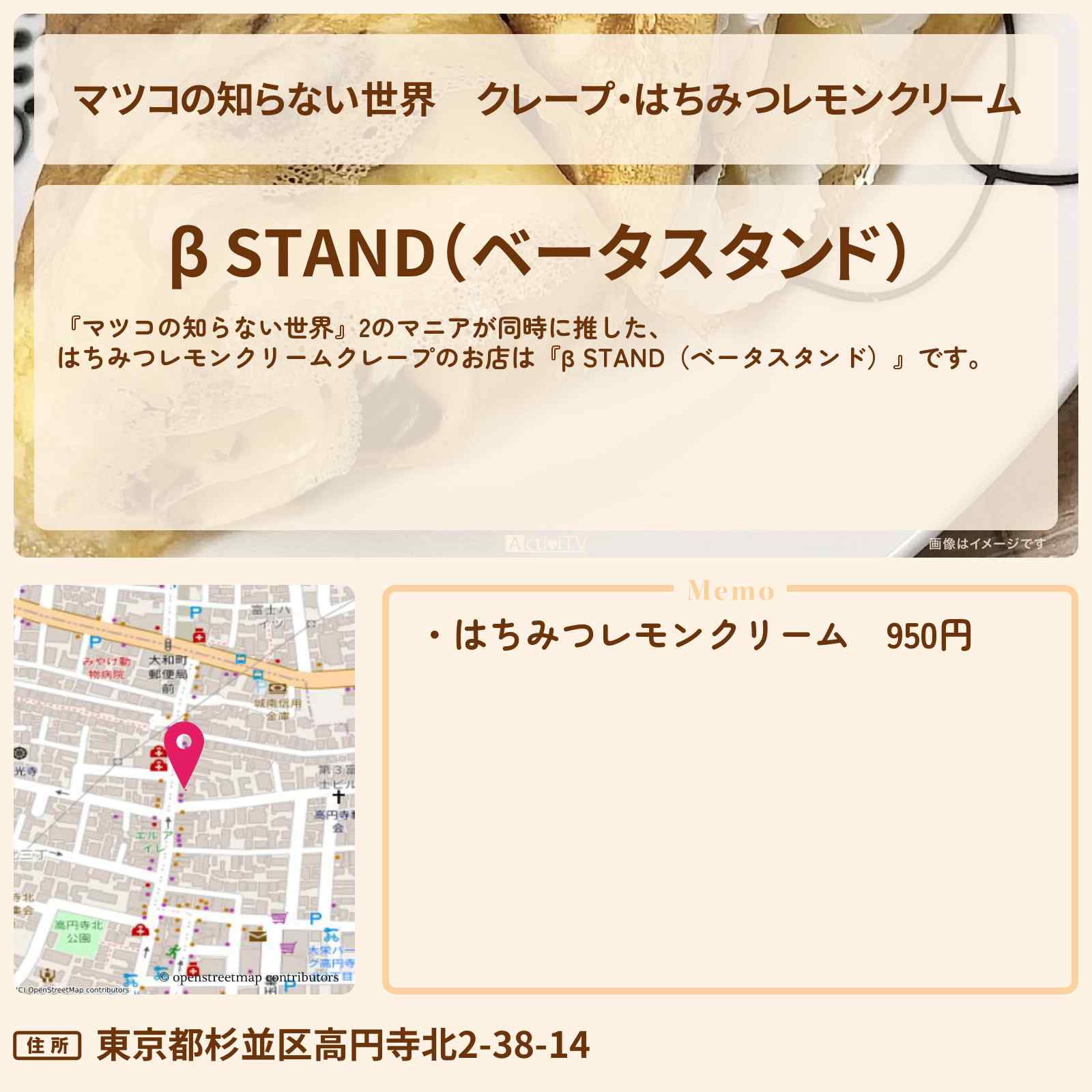 放送の【マツコの知らない世界】2のマニアが同時に推した、はちみつレモンクリームクレープのお店は『β STAND(ベータスタンド)』です。