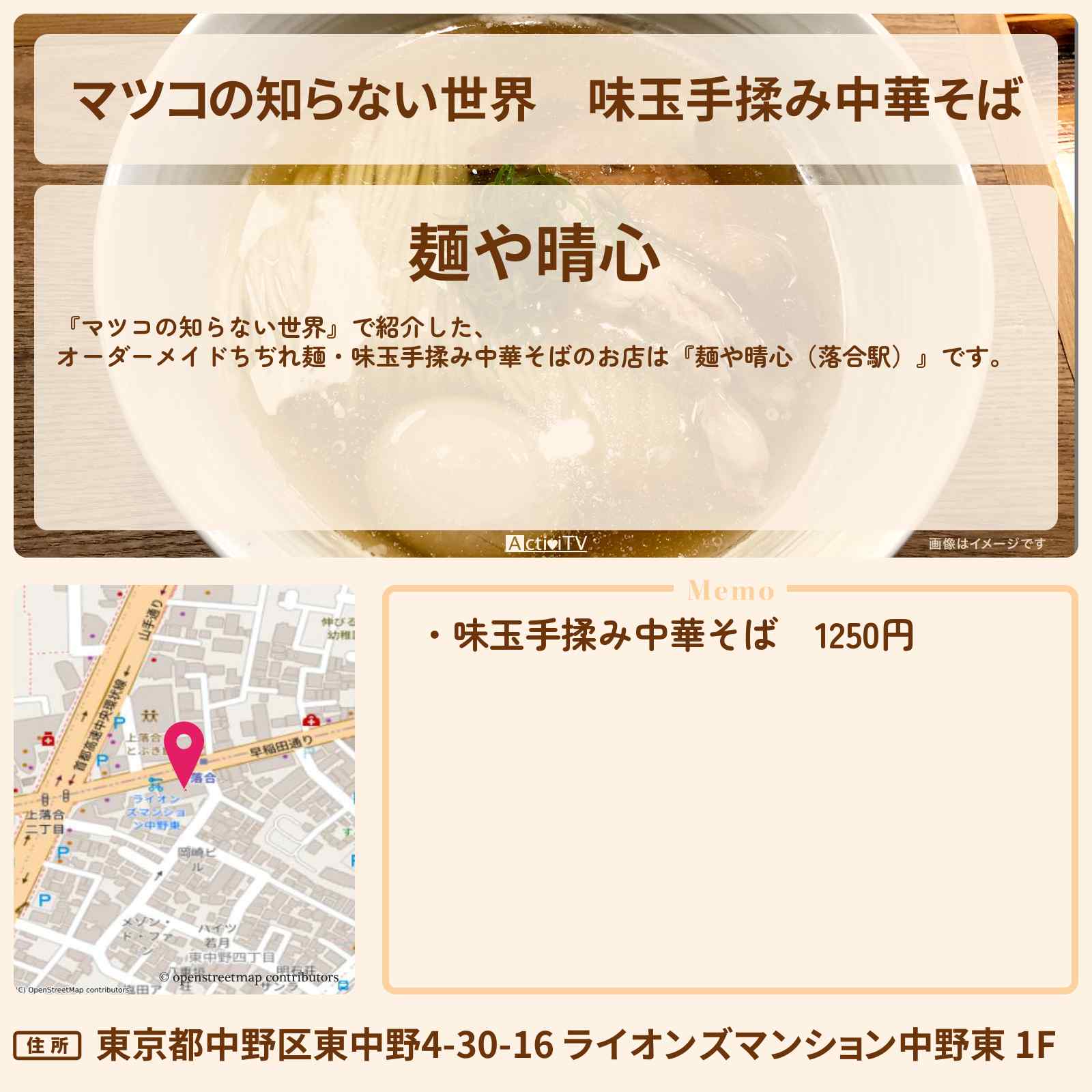 味玉手揉み中華そば 落合「麺や晴心」