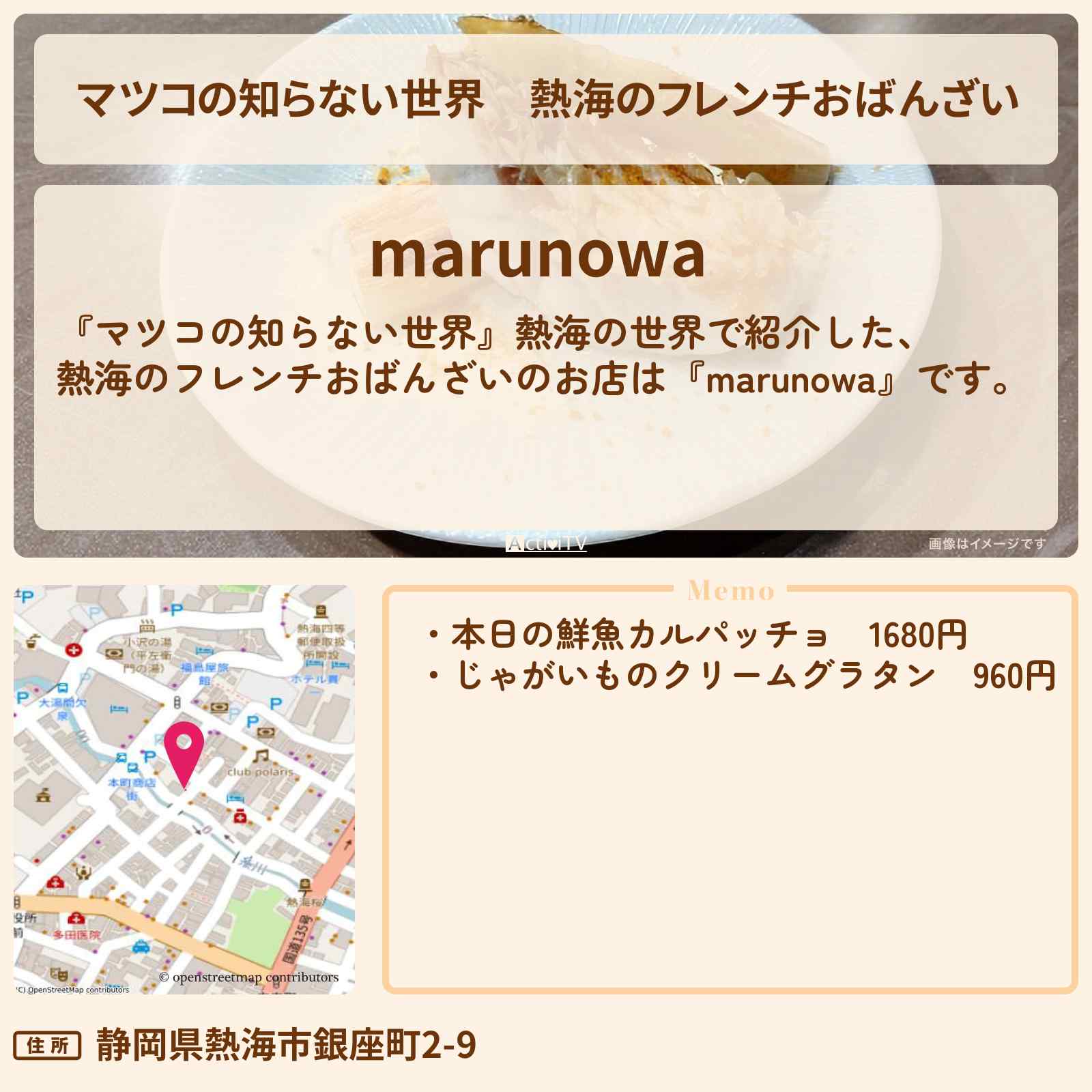 こちらは『marunowa(マルノワ)(熱海/ビストロ)』のお店ページです。Rettyで食が好きなグルメな人たちからお店を探そう!…