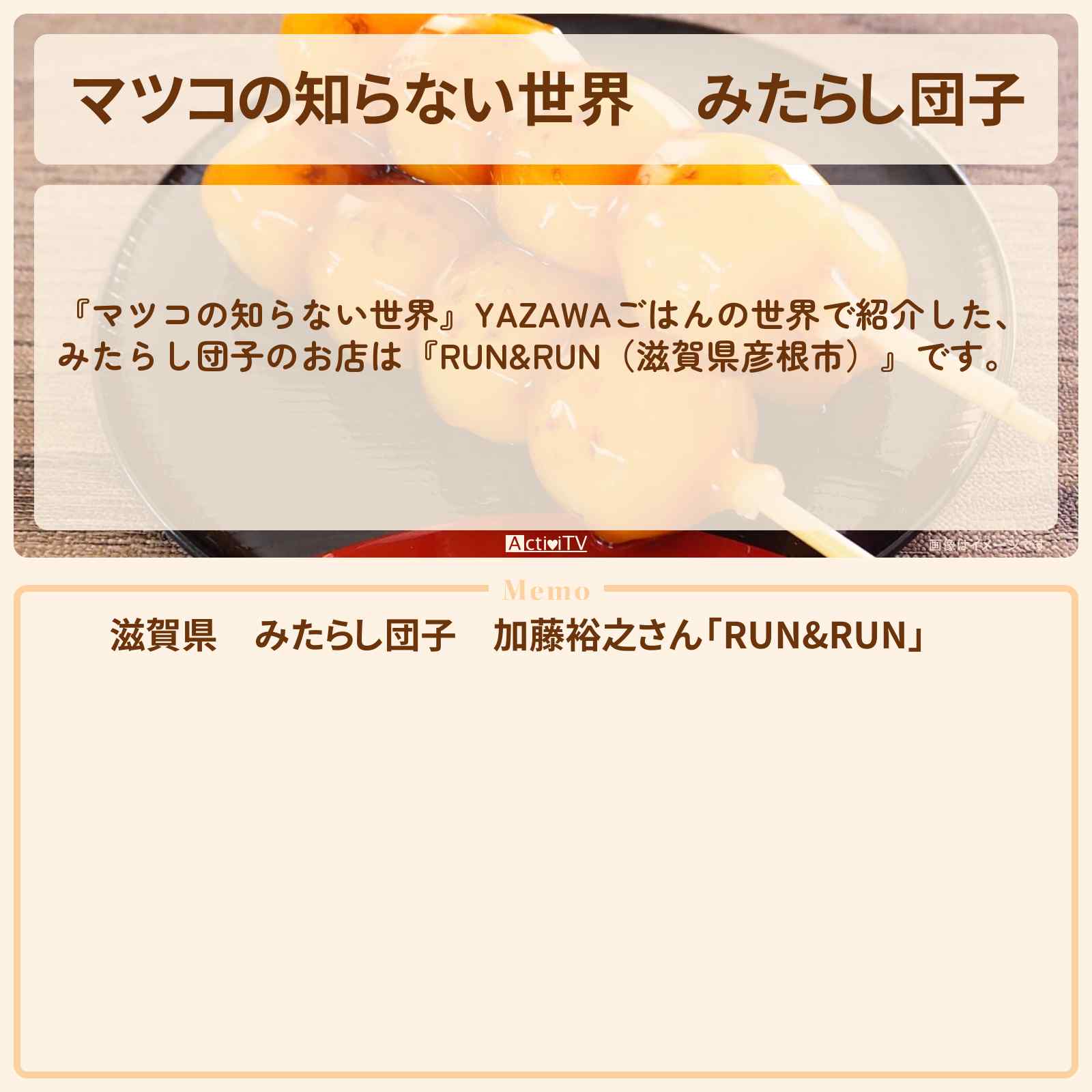放送の【マツコの知らない世界】YAZAWAごはんの世界で紹介した、みたらし団子のお店は『RUN&RUN(滋賀県彦根市)』です。