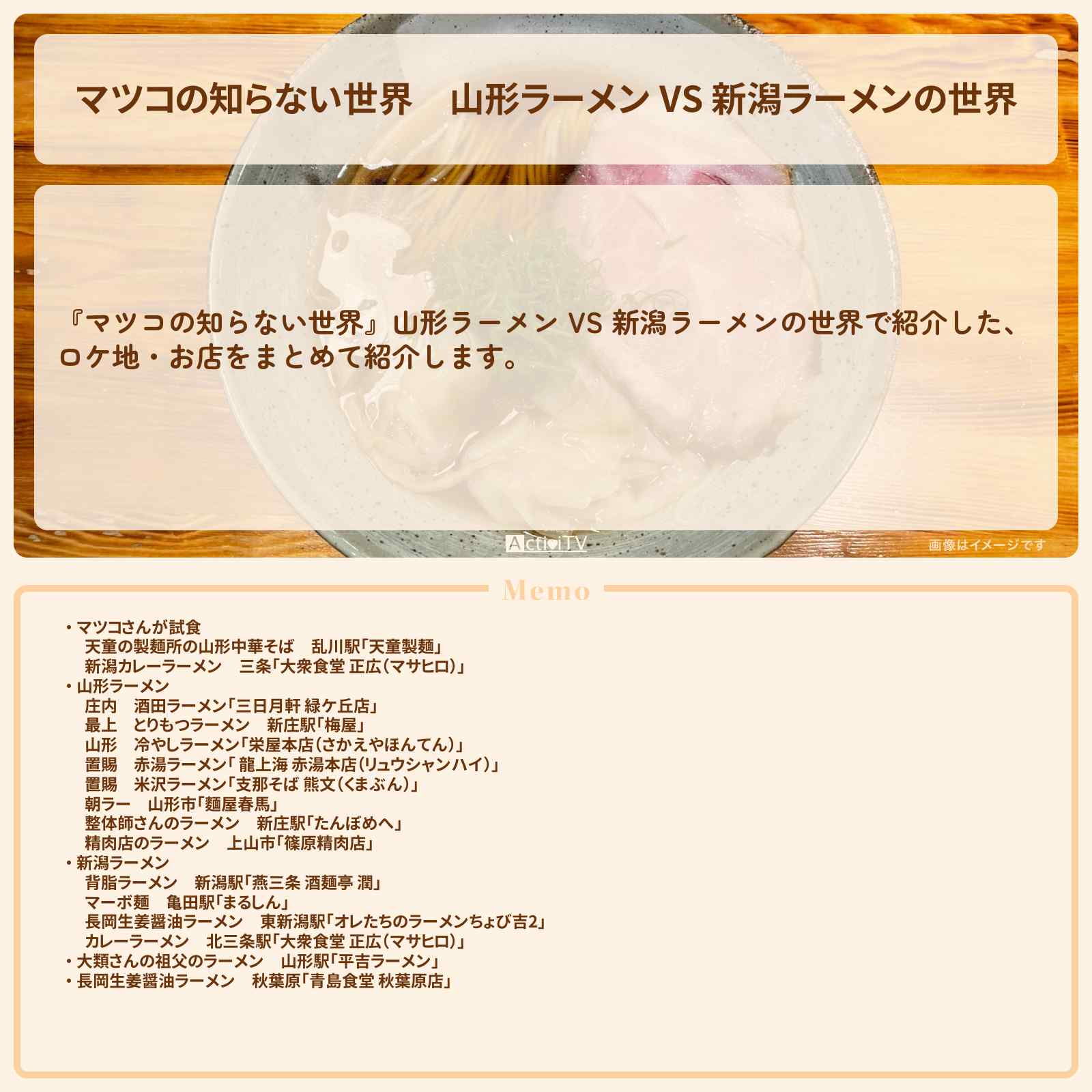 放送の【マツコの知らない世界】山形ラーメン VS 新潟ラーメンの世界で紹介した、ロケ地・お店をまとめて紹介します。