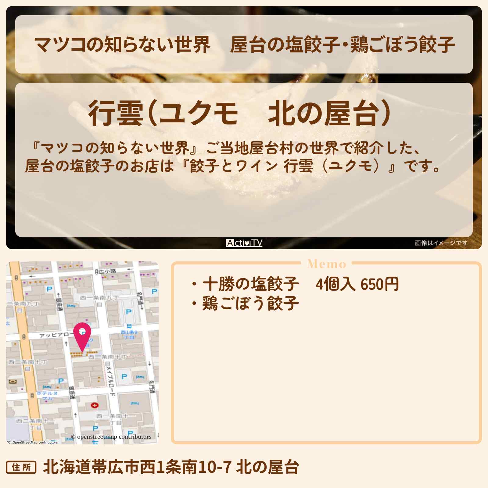 放送の【マツコの知らない世界】ご当地屋台村の世界で紹介した、屋台の塩餃子のお店は『餃子とワイン 行雲(ユクモ)』です。