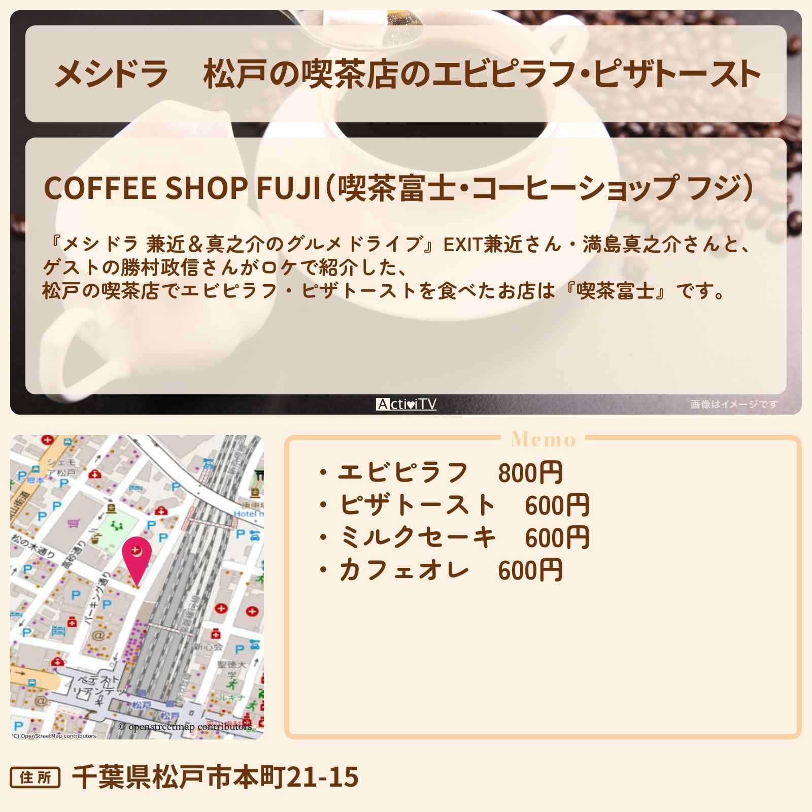 放送の【メシドラ 兼近&真之介のグルメドライブ】EXIT兼近さん・満島真之介さんと、ゲストの勝村政信さんがロケで紹介した、松戸の喫茶店でエビピラフ・ピザトーストを食べたお店は『喫茶富士』です。