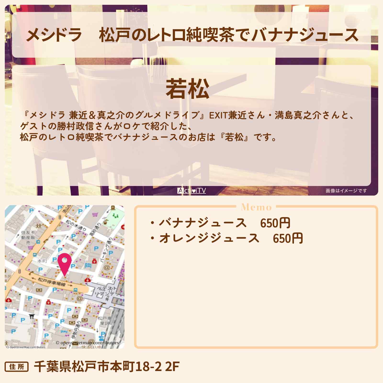 放送の【メシドラ 兼近&真之介のグルメドライブ】EXIT兼近さん・満島真之介さんと、ゲストの勝村政信さんがロケで紹介した、松戸のレトロ純喫茶でバナナジュースのお店は『若松』です。