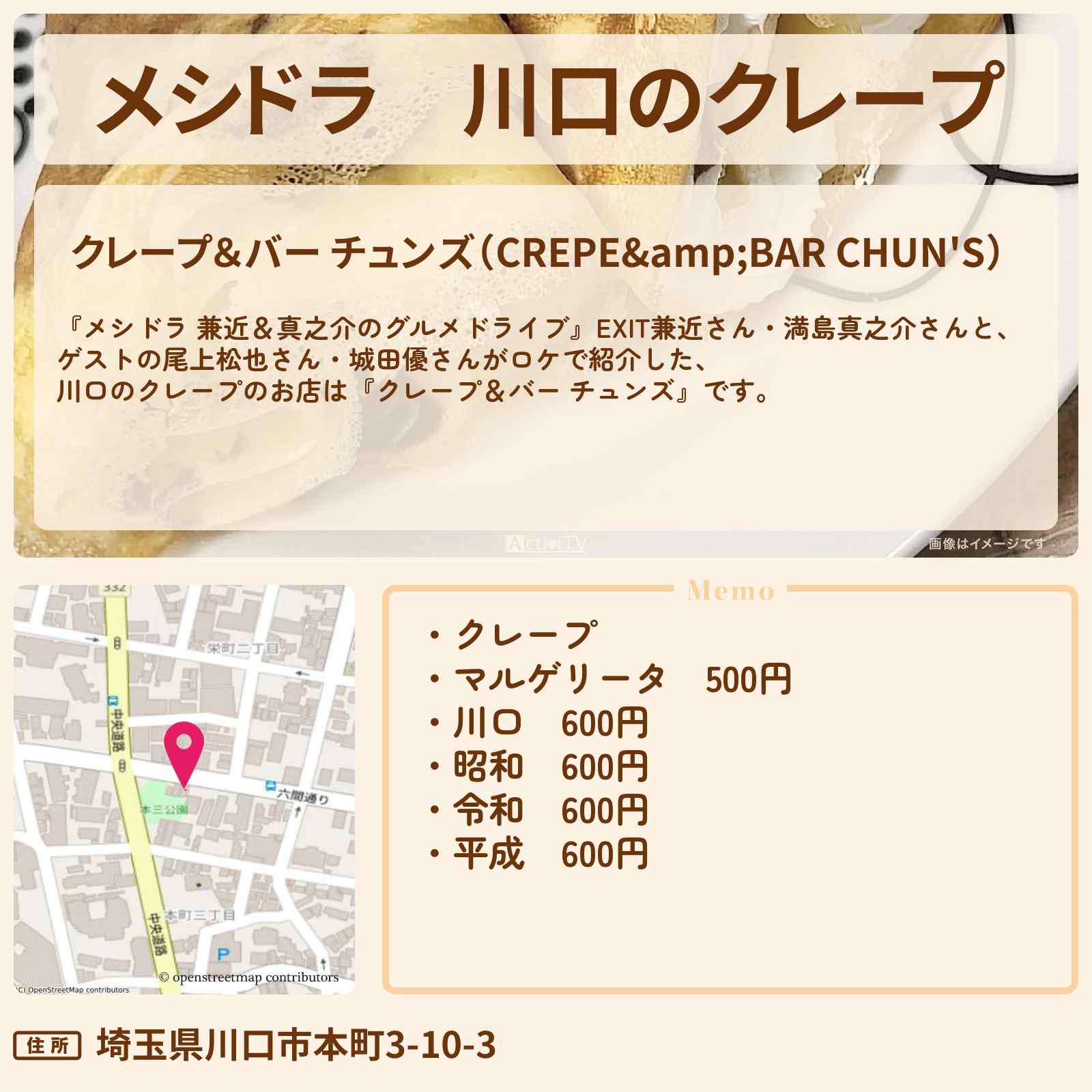 放送の【メシドラ 兼近&真之介のグルメドライブ】EXIT兼近さん・満島真之介さんと、ゲストの尾上松也さん・城田優さんがロケで紹介した、川口のクレープのお店は『クレープ&バー チュンズ』です。