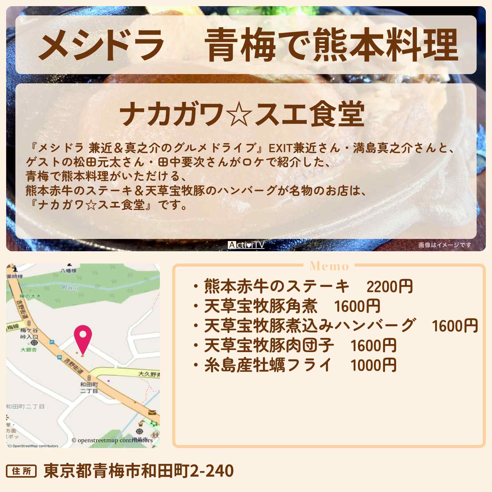 放送の【メシドラ 兼近&真之介のグルメドライブ】EXIT兼近さん・満島真之介さんと、ゲストの松田元太さん・田中要次さんがロケで紹介した、青梅で熊本料理がいただける、熊本赤牛のステーキ&天草宝牧豚のハンバーグが名物のお店は、『ナカガワ☆スエ食堂』です。