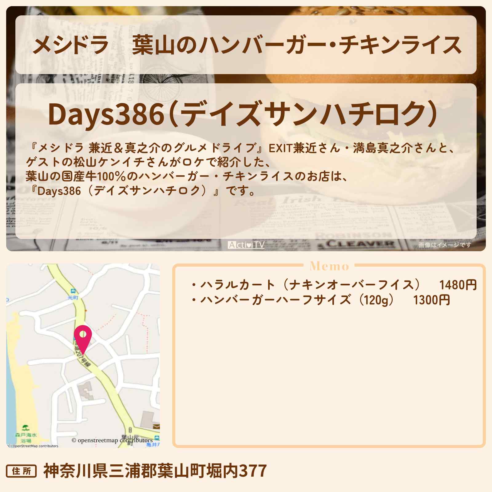 放送の【メシドラ 兼近&真之介のグルメドライブ】EXIT兼近さん・満島真之介さんと、ゲストの松山ケンイチさんがロケで紹介した、葉山の国産牛100%のハンバーガー・チキンライスのお店は、『Days386(デイズサンハチロク)』です。