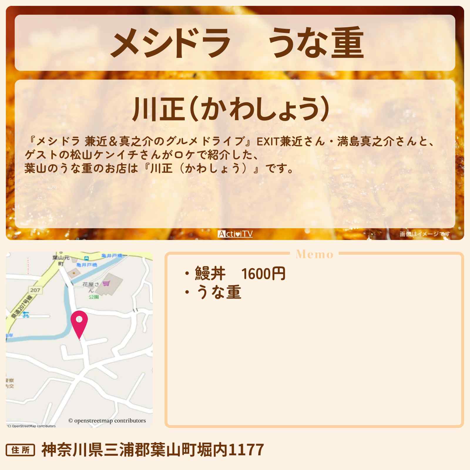 放送の【メシドラ 兼近&真之介のグルメドライブ】EXIT兼近さん・満島真之介さんと、ゲストの松山ケンイチさんがロケで紹介した、葉山のうな重のお店は『川正(かわしょう)』です。