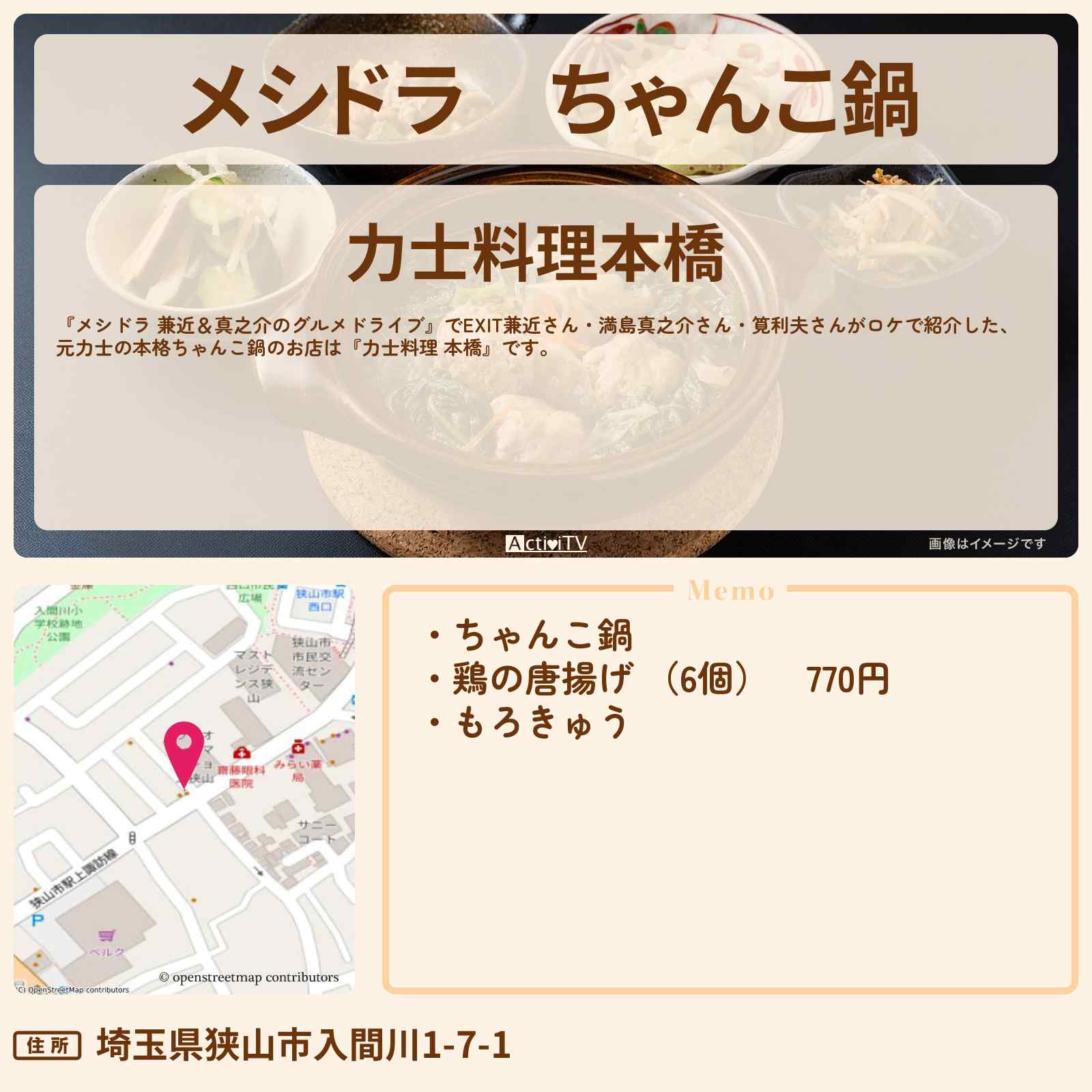 放送の【メシドラ 兼近&真之介のグルメドライブ】でEXIT兼近さん・満島真之介さん・筧利夫さんがロケで紹介した、元力士の本格ちゃんこ鍋のお店は『力士料理 本橋』です。