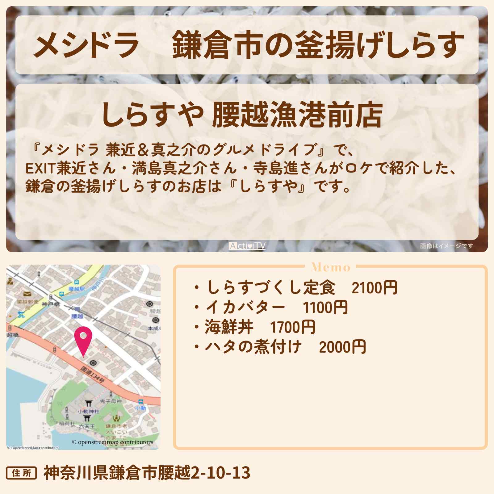 放送の【メシドラ 兼近&真之介のグルメドライブ】で、EXIT兼近さん・満島真之介さん・寺島進さんがロケで紹介した、鎌倉の釜揚げしらすのお店は『しらすや』です。